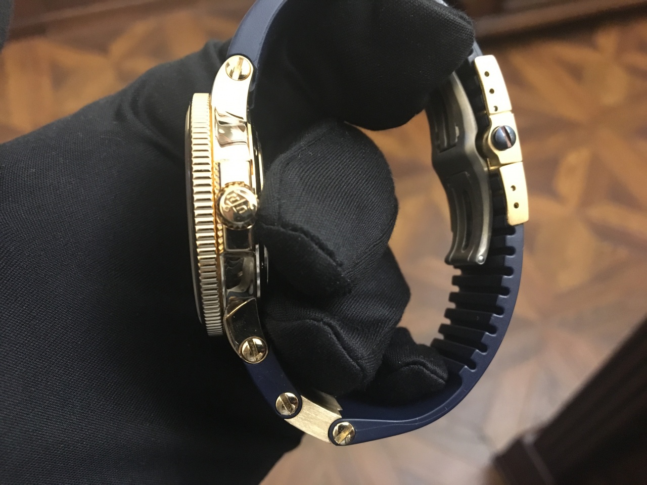 Часы из модельного ряда Marine от Ulysse Nardin отличаются предельной прочностью, надежностью, бескомпромиссным качеством. Выполненные в спортивном стиле, они функциональны, водонепроницаемы и удароустойчивы. Эти часы незаменимы для мужчин, ведущих активный образ жизни. Часы модели 266-68LE-3 выпущены ограниченным количеством экземпляров. Изготовленный из розового золота 18 карат корпус часов, имеет размер 41 мм. Корпус часов толщиной 12,5 мм. Механический калибр с функцией автоподзавода, который приводит в движение стрелки, собран лучшими мастерами. Часы предназначены для того, чтобы в них плавали и имеют водонепроницаемость 100 м. Циферблат закрыт прозрачным антибликовым стеклом из сапфирового хрусталя высокой прочности, благодаря чему обеспечивается максимальная защита от сколов и механических повреждений. Для изготовления задней крышки корпуса часов также применяется сапфировое стекло, благодаря чему обеспечивается обзор на работу часового механизма. Модель поставляется на каучуковом ремешке с раскладывающейся золотой застежкой. Ограниченная серия (Limited Edition) 350 шт. Хронометр. Запас хода до 42 часов. Задняя крышка прозрачная.