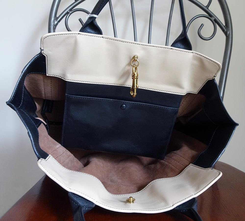 Внутри одно просторное отделение, на одной стороне кожаный карман на кнопке. Ручки позволяют носить сумку в руках, на локте, и на плече.