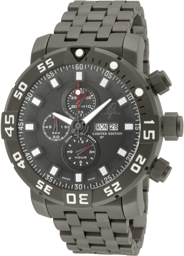 Корпус и браслет титановые, стекло – сапфировое, с антибликовым покрытием. Хронограф, секундомер, число, день недели. Водонепроницаемость 1000 метров. Головки и кнопки на резьбе. Диаметр корпуса 53 мм. Браслет длинный (212 мм), удобен даже для крупного запястья.
