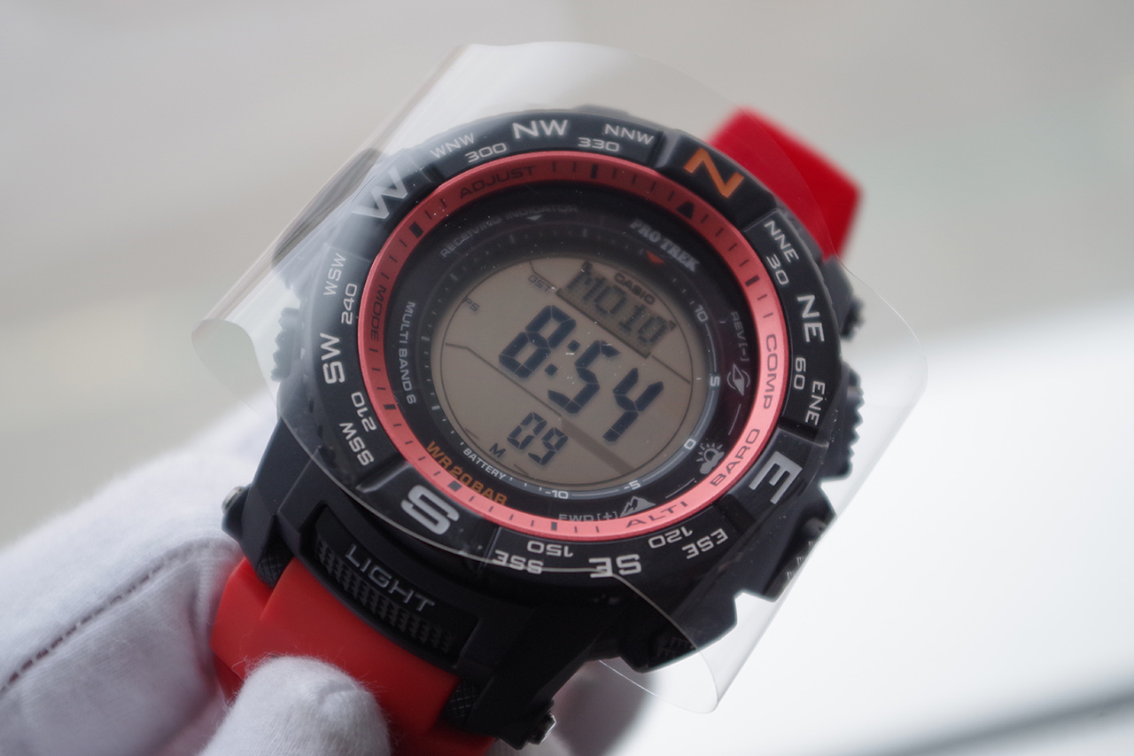 Protrek. Циферблат подсвечивается ярким светодиодом, при недостаточном освещении во время поворота запястья в сторону лица подсветка включается автоматически. Питание от солнечной энергии, индикатор заряда батареи. Модуль часов рассчитан на работу при низких температурах. Функция автоматического сохранения энергии. Время работы аккумулятора без подзарядки - 7 месяцев, при включенной функции сохранения энергии - 23 месяца. Коррекция текущего времени радиосигналом на территории почти всей Европы, США, Японии и Китая. Встроенный цифровой компас. Высотомер - встроенный датчик барометрического давления с возможностью вывода результатов в единицах высоты над уровнем моря (от -700 до 10000 метров). Барометр - измерение атмосферного давления от 260 до 1100 гПа (от 195 до 825 мм рт. ст.). Встроенный датчик температуры от -10° до +60°С с точностью 0,1°C. Время восхода и захода Солнца. Секундомер с точностью показаний 1/10с и временем измерения 1000ч. Таймер обратного отсчета от 1мин до 24ч. Мировое время. 12-ти и 24-х часовой формат времени. Функция отключения/включения звука. Стальной вращающийся безель с IP покрытием.