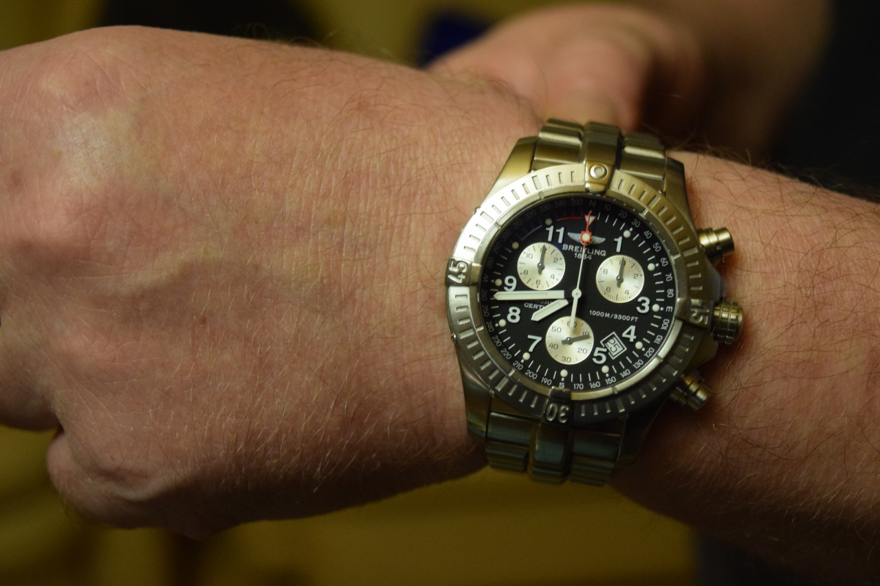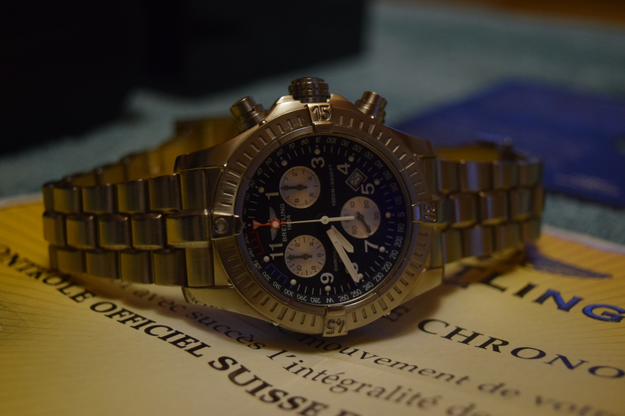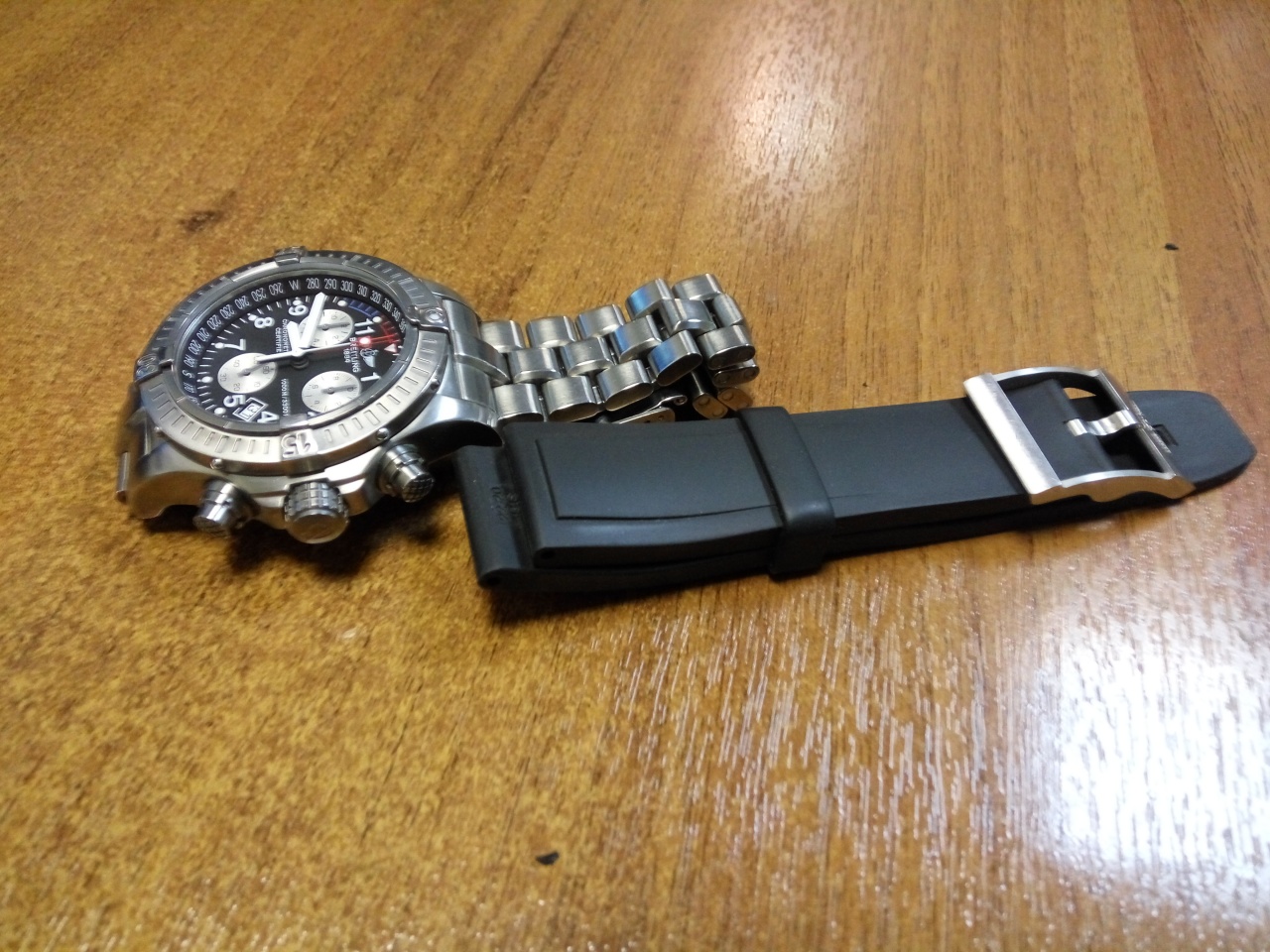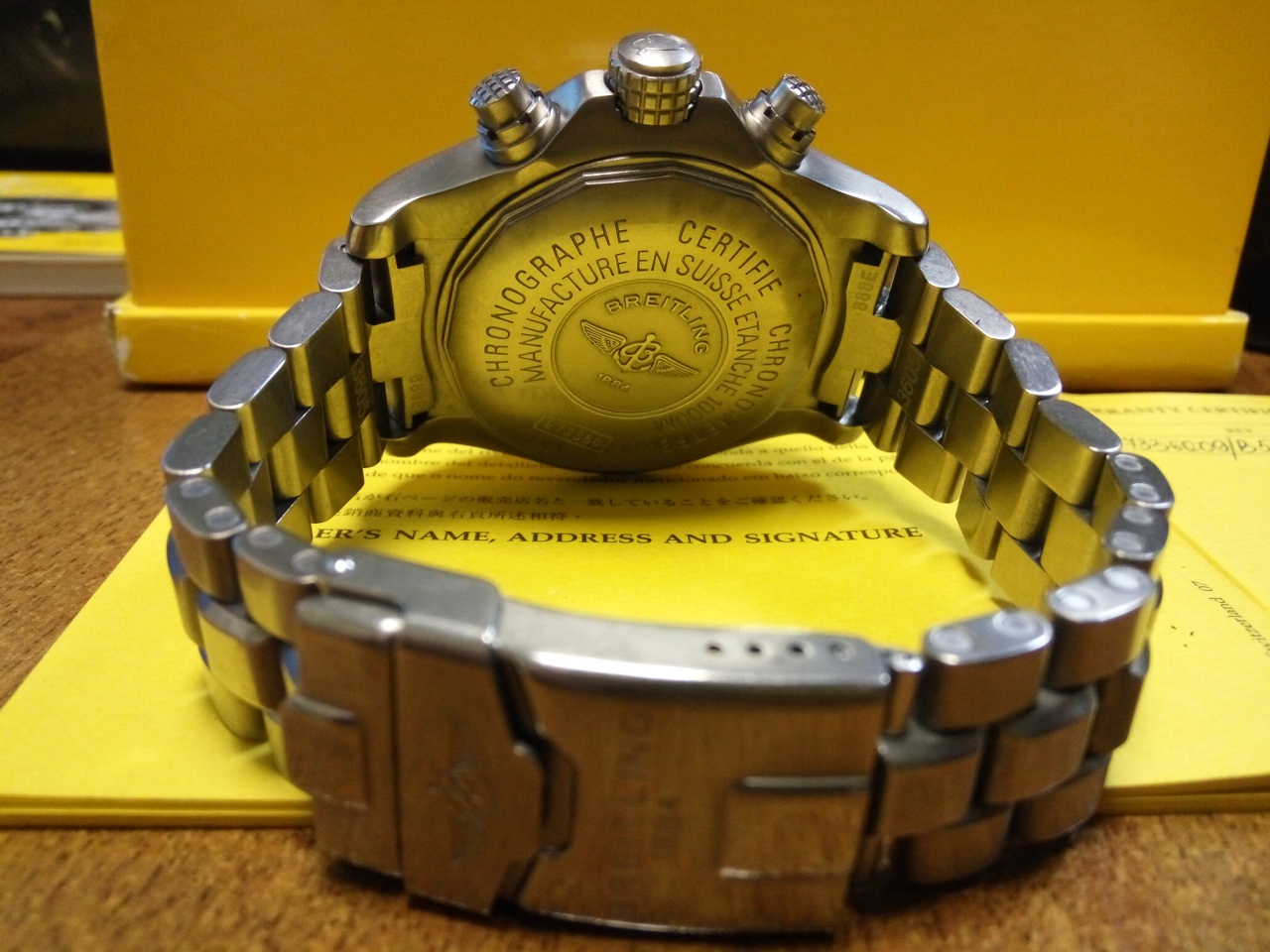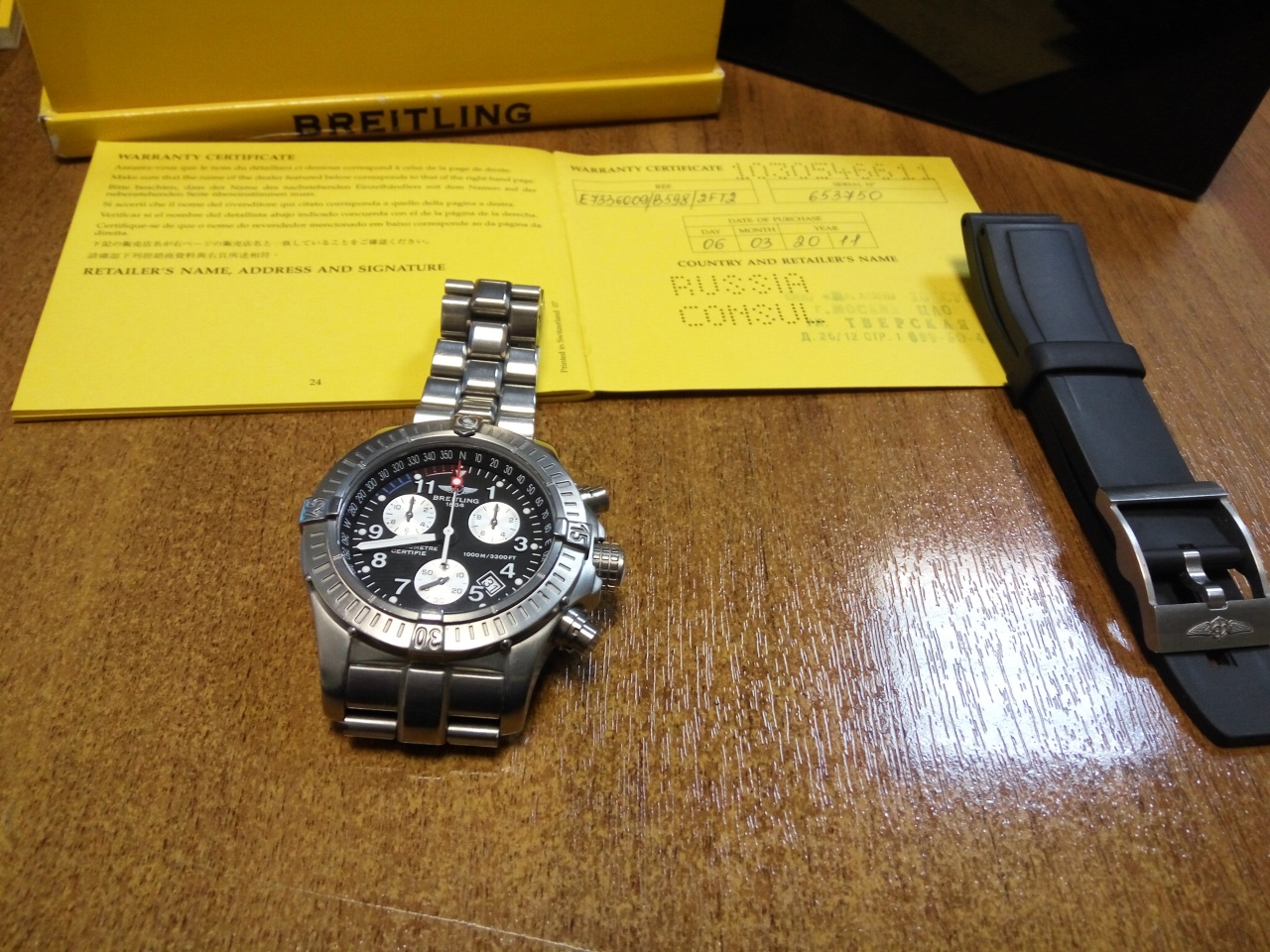 Часы покупались новыми в КОНСУЛЕ в 2011 году. Сейчас часы в хорошем состоянии, присутствуют следы естественной носки. Антиблик в отличном состоянии. В качестве бонуса при покупке, в подарок оригинальный каучуковый ремешок Breitling.