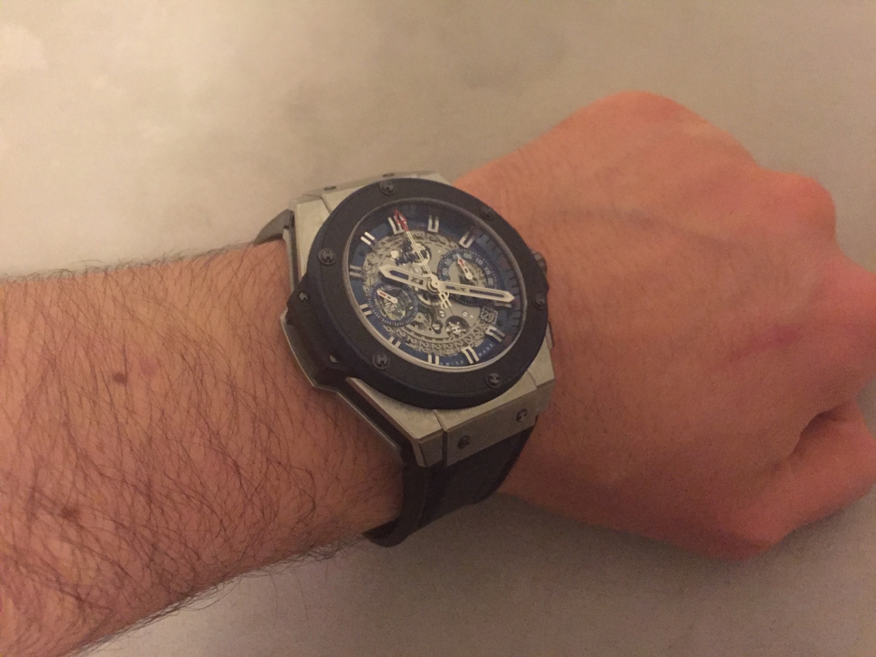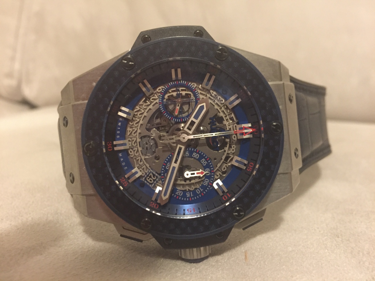 В продаже единственные в своем роде часы Hublot с карбоновым безелем голубого цвета, в размере 48 мм!!!