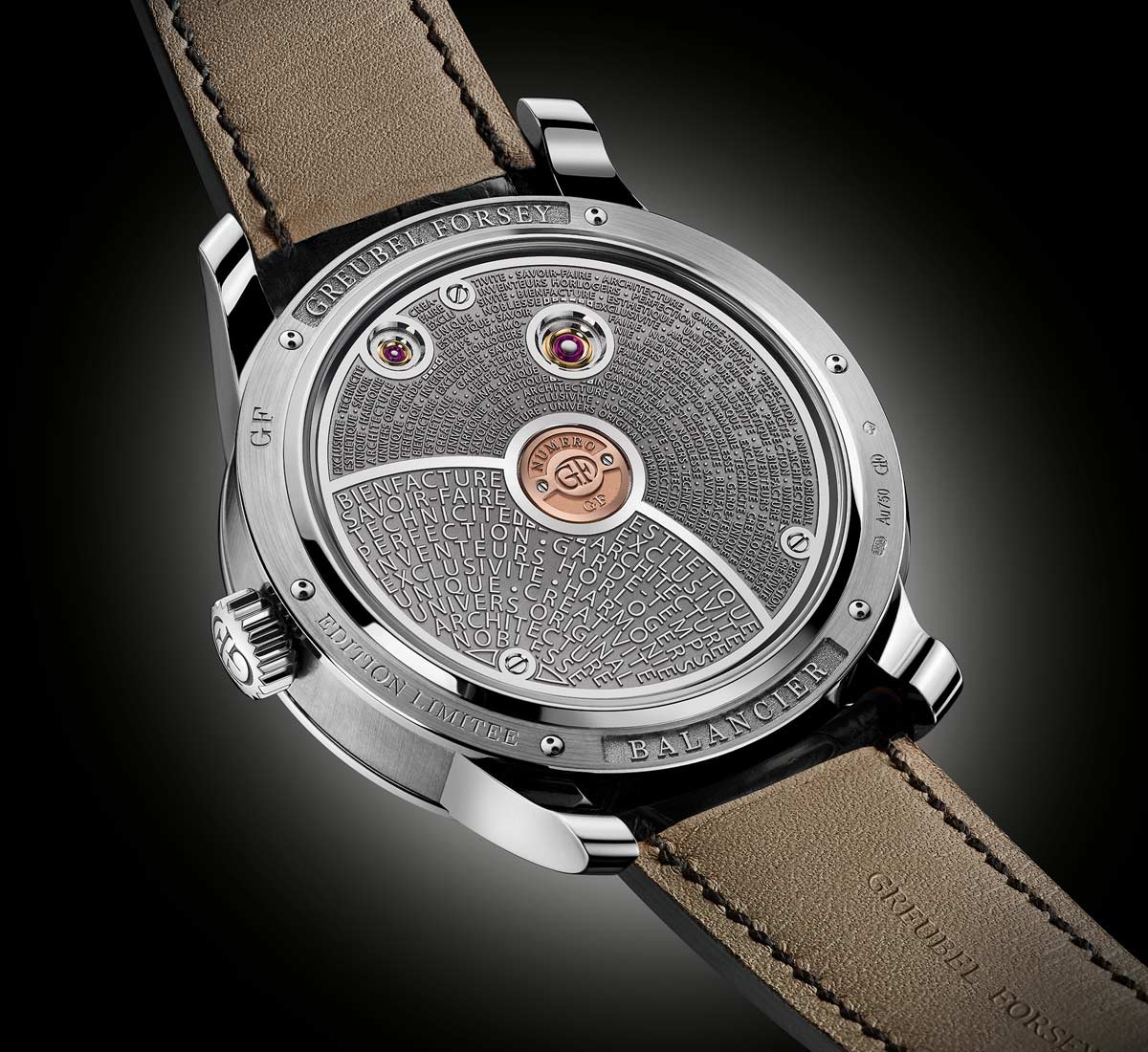Швейцарская часовая компания Greubel Forsey представила на крупнейшей в мире международной часовой выставке Baselworld-2017 свою новую лимитированную модель Balancier, отличающееся, как это и явствует из ее наименования, новым балансовым колесом диаметром 12,6 мм, просматриваемому на циферблате в апертуре между 8 и 9 часами, закрепленному под полированным мостом, с шестью регулировочными золотыми винтами и оптимизированными аэродинамическими качествами, разработанными для повышения генерирования мощности, что улучшает хронометрическую стабильность.