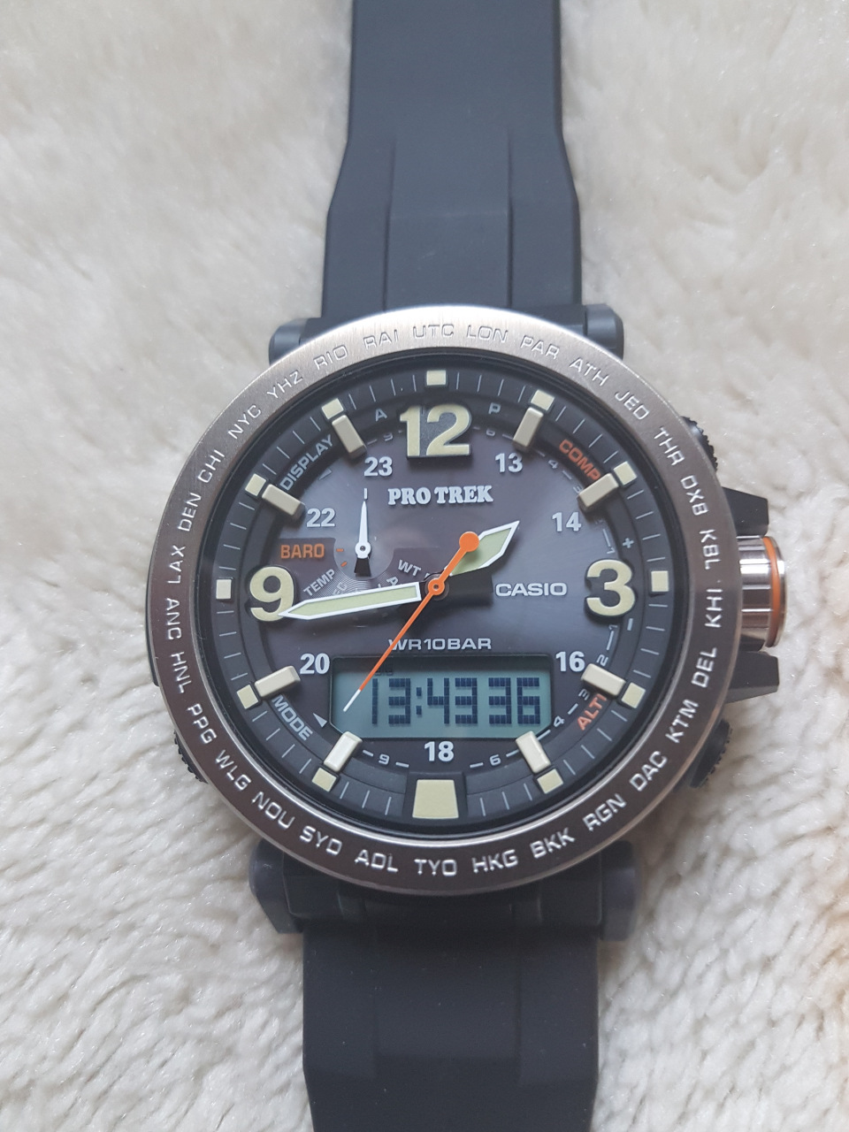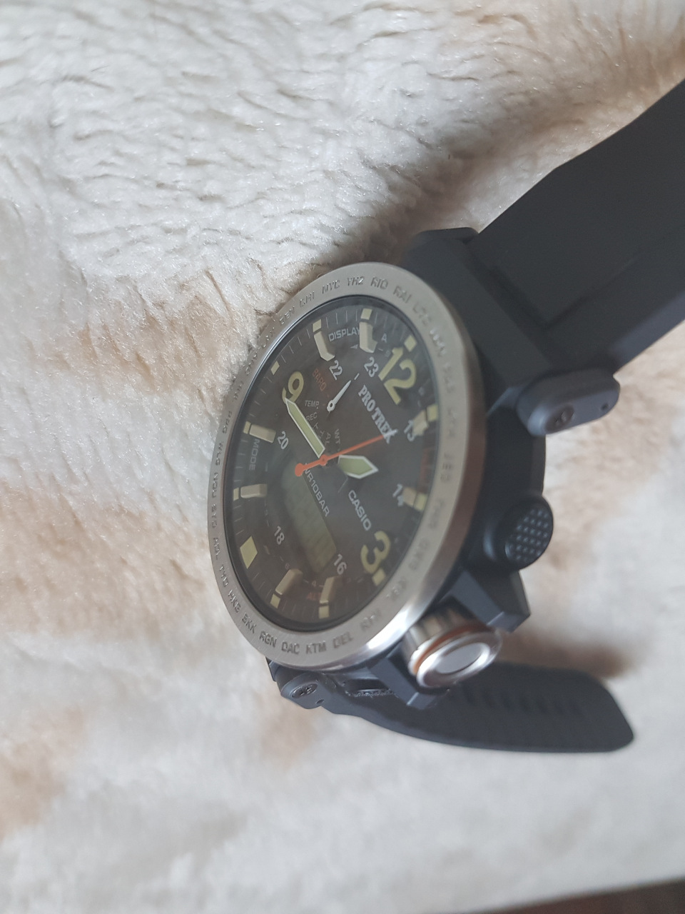 Если кратко по характеристикам: новый тройной сенсор (датчик атмосферного давления над уровнем моря; индикатор изменения и хода магнитуды давления; измерение высоты над уровнем моря, превышений/спуска/подъема; датчик температуры; мировое время; секундомер; таймер; 4 будильника; аналоговое и цифровое время; дата и день недели; диодная и люминесцентная подсветка). Часы на приятном, мягком и прочном силиконовом ремешке. Очень легкие - едва ощутимы на руке. Безель металлический, минеральное стекло. Часы в полном комплекте, с гарантией от Касио. Причина продажи - были куплены в подарок, увы, не сели на руку (большие). Без пересыла. Cheers