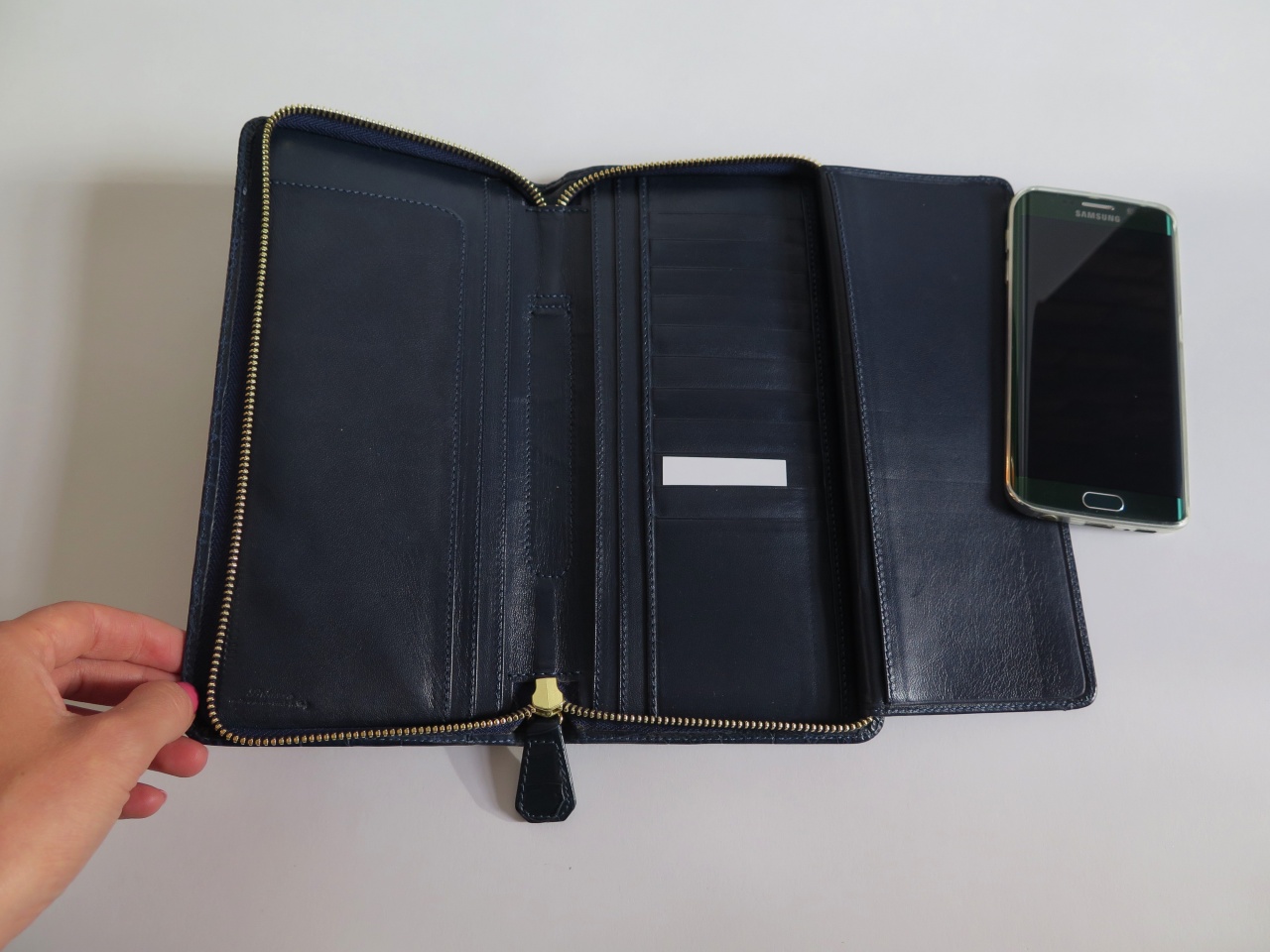 Клатч застегивается на позолоченную молнию и имеет пять больших отделений для банкнот, десять отделений для кредитных карт или визиток, отделения для чековой книжки, паспорта, водительских прав, авиабилета и других документов, ручки.