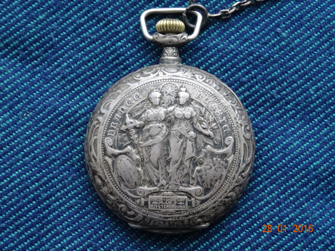 Часы, завоевавшие Grand prix и 6 медалей французской выставки в Париже в 1900 году, были выпущены после дружественного визита крейсеров "Варяг" и "Светлана" в конвоировании царской яхты "Штандарт" для участия в торжествах, устроенных французскими союзниками в честь русских моряков. В память визитов эскадр Российского и Французского ВМФ в военную базу Тулон и Кронштадт в 1891,1893 гг. На задней крышке изображены две женские фигуры символизирующие Россию и Францию в период существования соглашение между Российской империей и Французской республикой о создании Франко-русского союза.