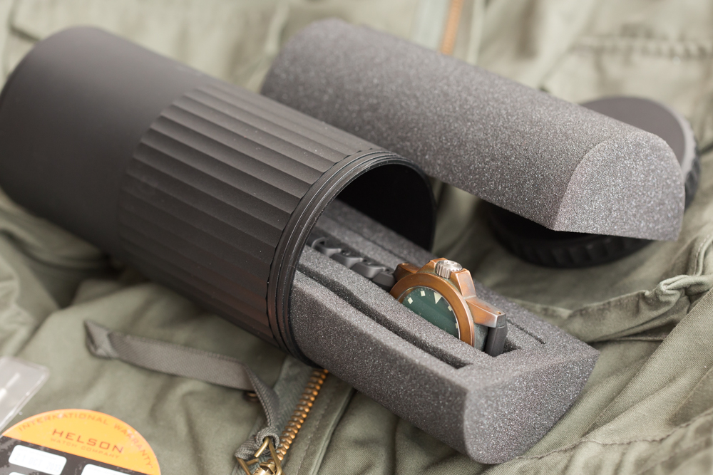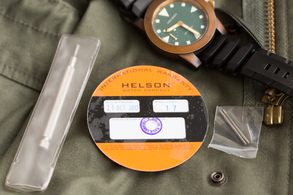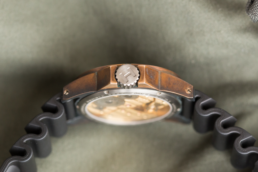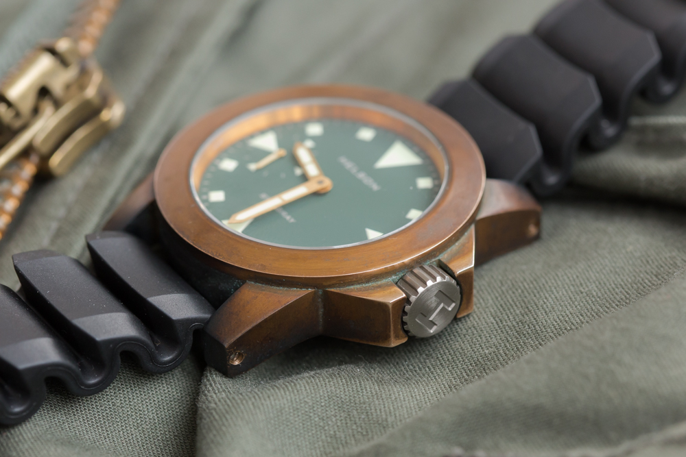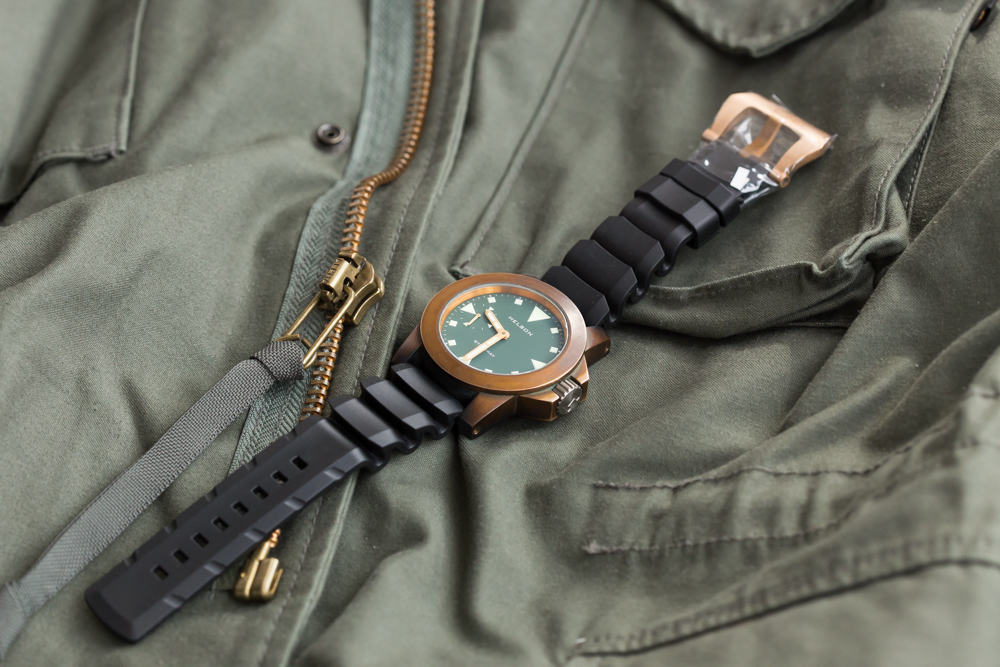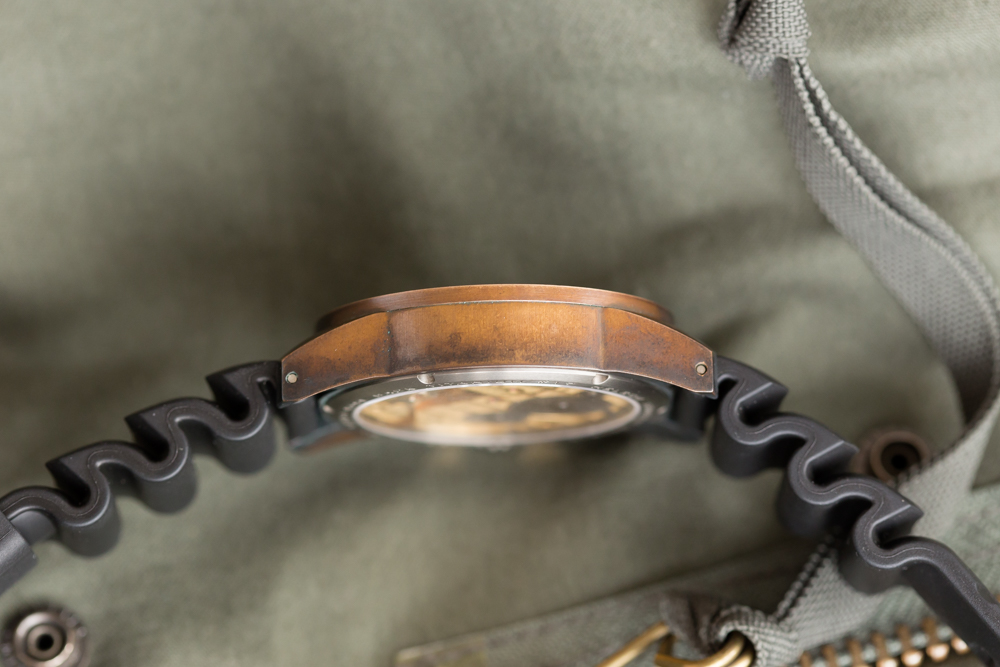 Настоящая патинирующаяся, зеленеющая бронза, зеленый циферблат, прозрачная задняя крышка. Каучуковый ремень, бронзовая бакля (22 мм.), с которой даже защитная пленка не снималась.