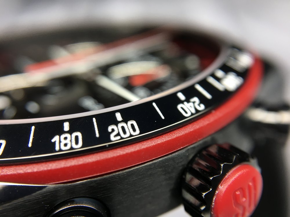 Многофункциональный хронограф с счетчиками часов, минут, секунд и 100-х долей секунд, люминесцентное покрытие индексов, часовой и минутной стрелок, индикация даты и вынесенная секундная стрелка на "6" часов, тахиметрическая шкала