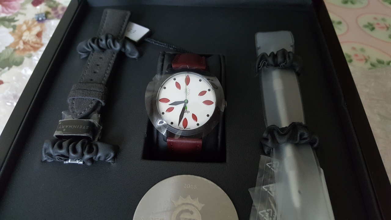 2 ремешка с черными застежками-бабочками, отвертка для замены ремней, черная лакированная коробка, гарантия 2 года, полный набор документов.