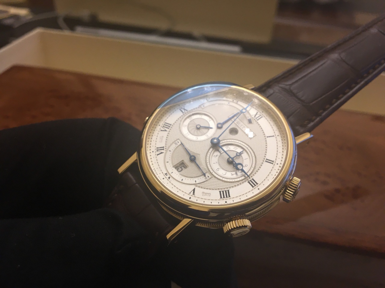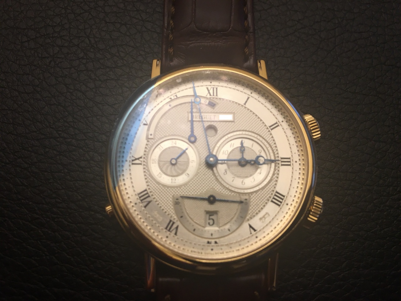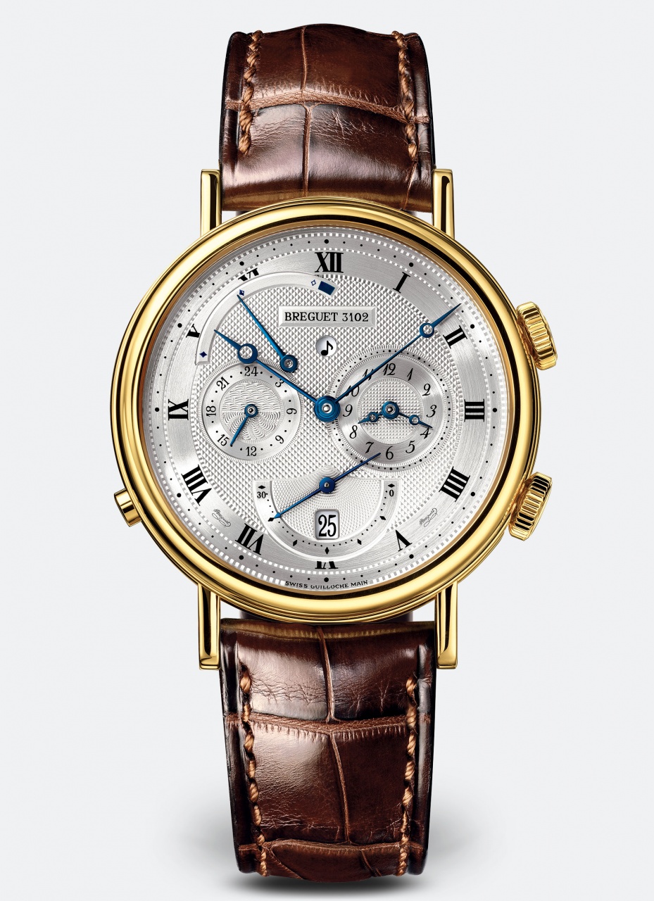 Механизм: автоматический, Breguet Калибр 519 F, 34 камня, запас хода 45 часов. Украшен в стиле Cotes de Geneve. Ротор из золота гильоширован вручную. Функции: часы, минуты, маленькая секундная стрелка, дата, время второго часового пояса (24-часовой циферблат), будильник. Корпус: желтое 18-каратное золото, из трех частей (диаметр 39 мм, толщина 11,25 мм); выпуклое сапфировое стекло; рифленая боковая поверхность; заводная головка (положение «2 часа») - для завода и установки времени, положение «4 часа» - для установки и завода будильника, в положении «8 часов» - для включения/выключения будильника; задняя крышка с сапфировым окном на 6 винтах. Водонепроницаемость 30 м. Циферблат: цельное золото, посеребренный; гильоширован вручную; стрелки Breguet из вороненой стали отделаны вручную; римские цифры и минутные деления на сатинированной внешней окружности тиснены штампом. Указатели: циферблат будильника - положение «3 часа», дата и маленькая секундная стрелка -положение «6 часов», время второго часового пояса на 24-часовом циферблате - положение «9 часов», индикатор запаса хода репетира - положение «11.30», индикатор включения будильника - положение «12 часов». Ремешок: крокодиловая кожа, застежка-замок из золота.