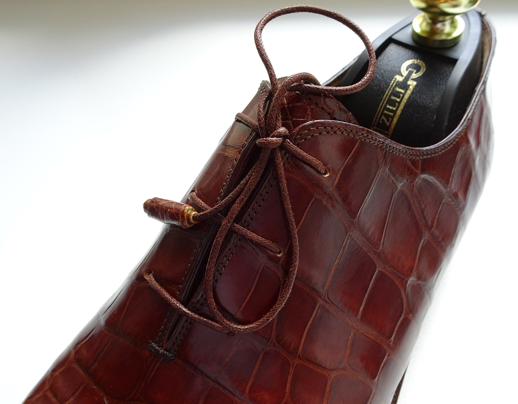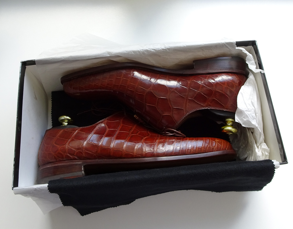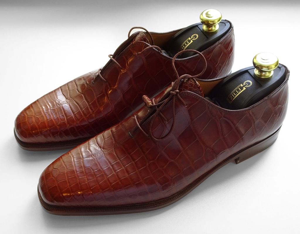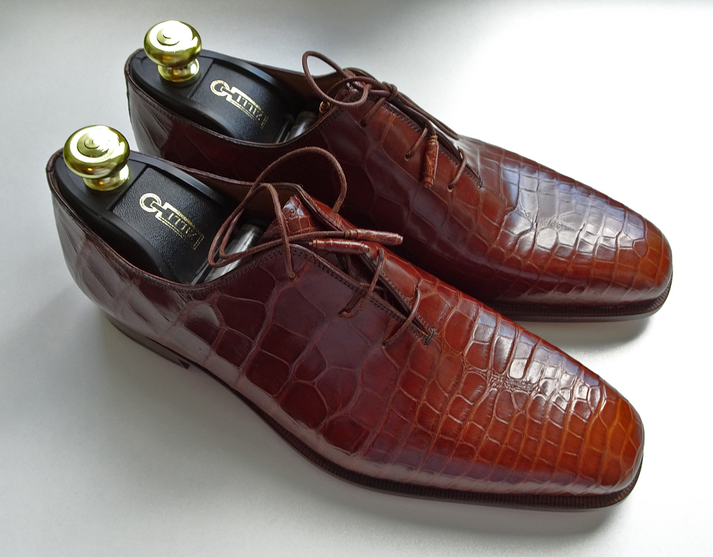 "Обычная" обувь из крокодила, сшитая из нарезанной кусками кожи, безусловно является дорогой и престижной - но по сложности изготовления, уровню мастерства и требованиям к отбору исходной кожи, рядом не стояла с цельнокройными моделями. У каждого бренда который имеет в своем ассортименте такие модели, это самая дорогая обувь.