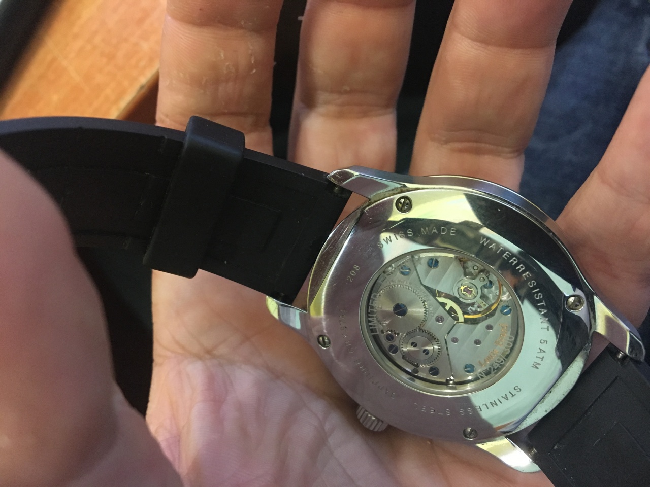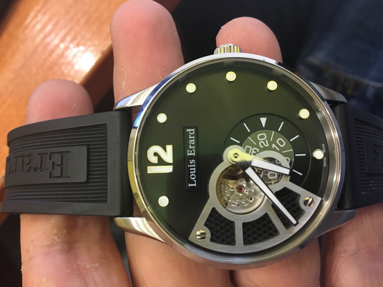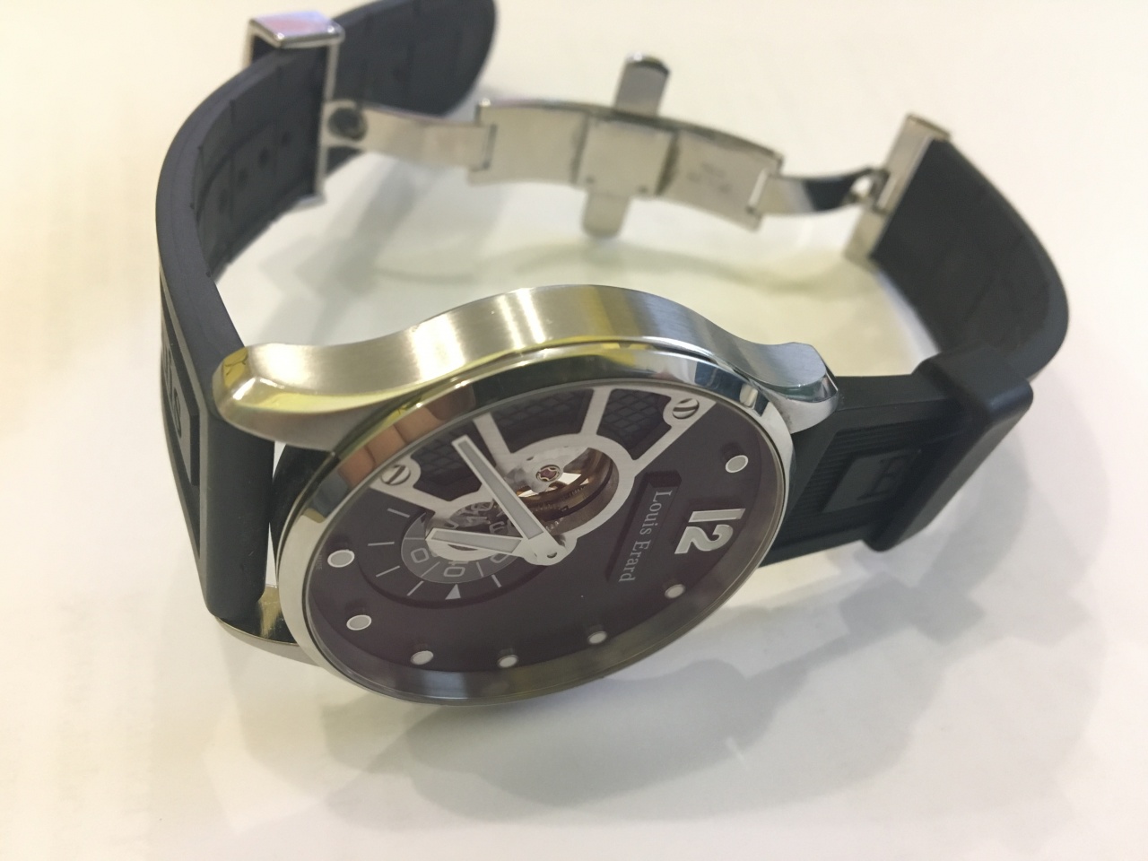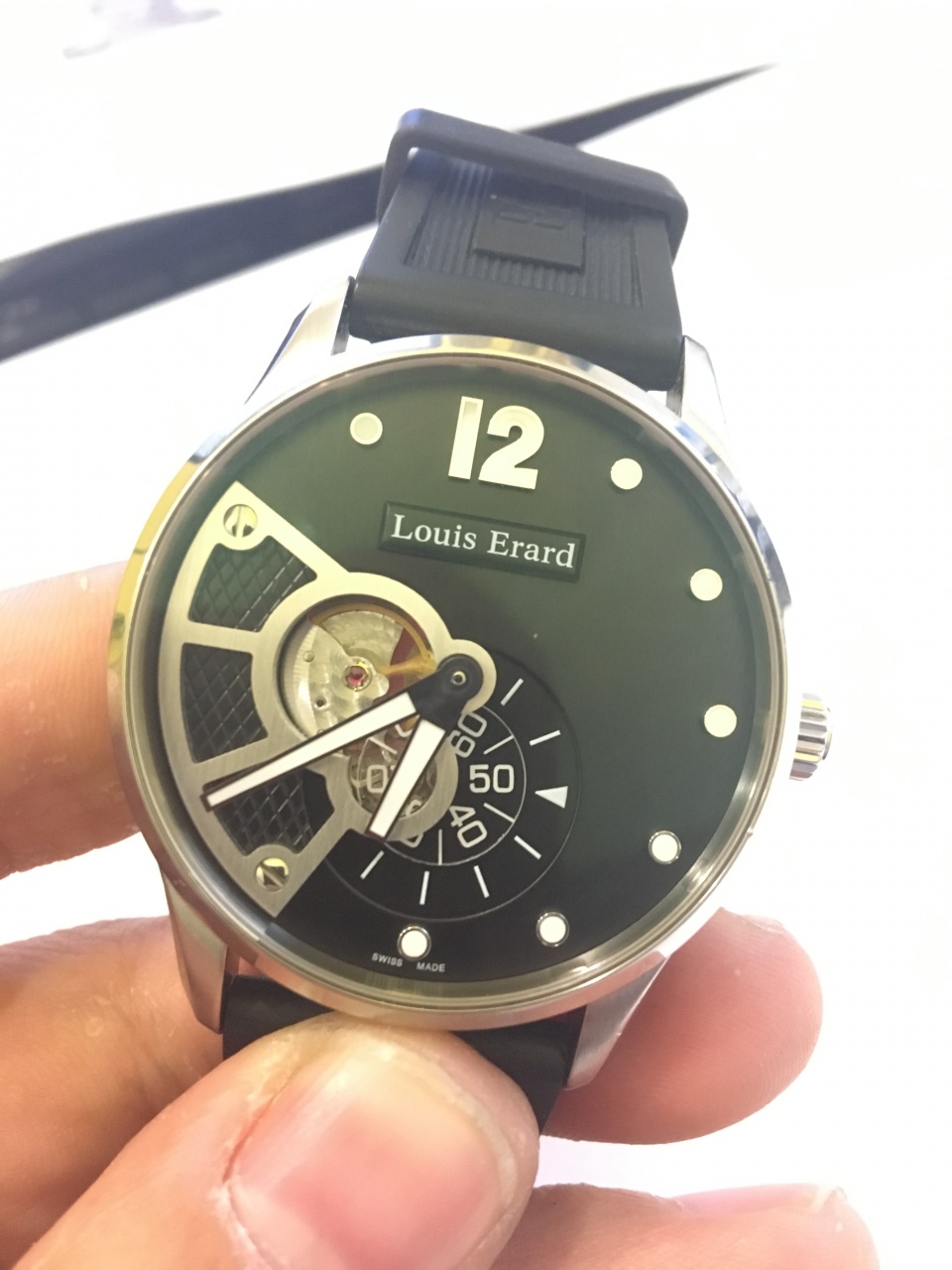 Описание Секундная стрелка вынесена на отдельный циферблат. Сквозь прозрачное окошко на циферблате можно наблюдать работу механизма часов.
