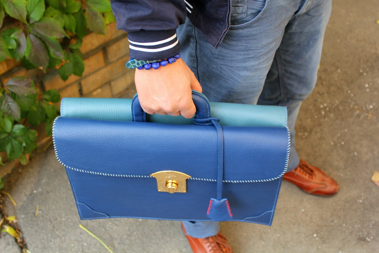 Уникальной особенностью портфеля является его конструкция, при которой одна сторона выполнена из кожи синего цвета, а другая сторона – из кожи лазурного цвета. Портфель застегивается на замки, запирающиеся на ключи.