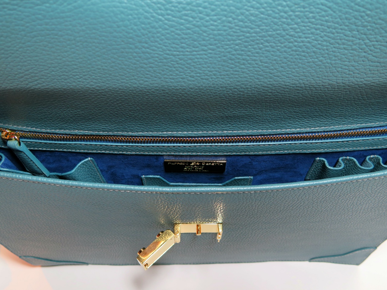 Детали и декоративные элементы портфеля изготовлены из стали, покрытой позолотой. Внутренняя часть портфеля изготовлена из 100% замши латиноамериканских пекари, и имеет два больших отделения для переноски документов и прочих вещей, одно дополнительное отделение, застегивающееся на молнию с бегунком, и кармашки для хранения 3 ручек, смартфона, визитных карточек.