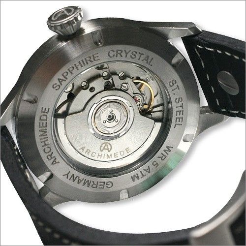 Круглый сатинированный корпус, изготовленный из нержавеющей стали, диаметром 42,0 мм, толщиной 9,5 мм, водонепроницаемый до 50 метров. На торце крупной рифленой заводной головки, выполненной в конусовидной форме и расположенной на 3 часах, выгравирован логотип бренда Archimede. Сапфировое стекло установлено на передней стороне часового корпуса (с антибликовым покрытием) и на его завинчивающейся задней крышке. Матово-черный циферблат с арабскими цифрами, разметкой, часовой и минутной стрелками, покрытыми люминесцентным составом белого цвета. Модель оснащена швейцарским автоматическим механизмом ETA 2893-2, на 21 камне, с балансовой частотой 28800 полуколебаний в час (4 гц), запасом хода 42 часа, функциями индикации часов, минут, секунд (посредством соответствующих центральных стрелок), даты (посредством цифрового указателя в апертуре прямоугольной формы, расположенной на 6 часах), а также времени второго часового пояса (посредством специальной центральной GMT-стрелки, выполненной в контрастном красном цвете, на круглой 24-часовой шкале, расположенной медиальнее основной шкалы циферблата).