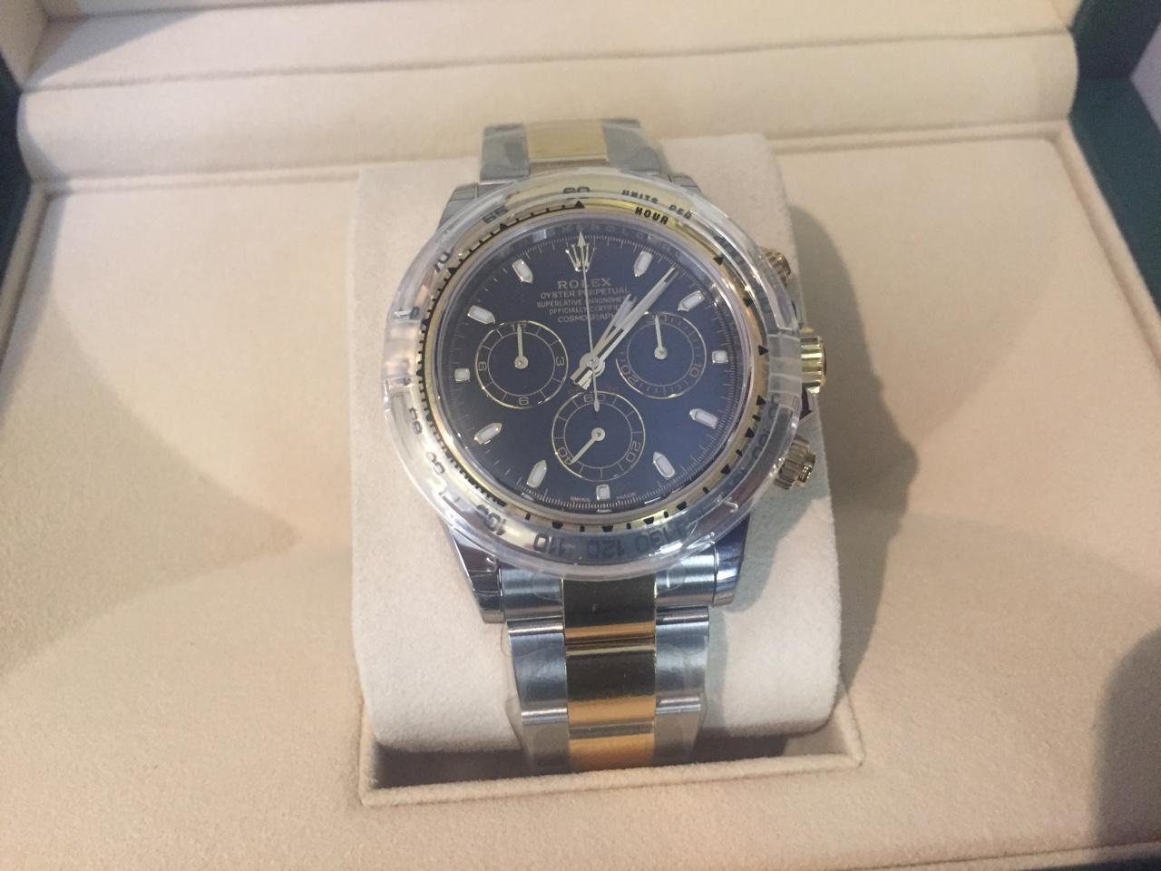 КОРПУС Oyster, 40 мм, сталь и желтое золото, КОНСТРУКЦИЯ OYSTER Цельный корпус, привинчиваемые крышка и заводная головка, ДИАМЕТР 40 мм, МАТЕРИАЛ Желтый Rolesor (сочетание стали 904L и 18‑каратного желтого золота), БЕЗЕЛЬ Фиксированный, с выгравированной тахиметрической шкалой, из 18-каратного желтого золота, ЗАВОДНАЯ ГОЛОВКА Привинчиваемая, с системой тройной герметизации Triplock, СТЕКЛО Сапфировое, устойчивое к появлению царапин, ВОДОНЕПРОНИЦАЕМОСТЬ До 100 м, МЕХАНИЗМ Perpetual, механический хронограф, автоматический подзавод, КАЛИБР 4130, мануфактурного производства Rolex, ТОЧНОСТЬ ХОДА -2/+2 сек/сутки (после установки механизма в корпус), ФУНКЦИИ Центральные часовая, минутная и секундная стрелки, маленькая секундная стрелка в положении «6 часов». Хронограф с центральной стрелкой с точностью до 1/8 секунды, 30-минутный счетчик в положении «3 часа», 12-часовой счетчик в положении «9 часов». Возможность остановки секундной стрелки для выставления точного времени, ОСЦИЛЛЯТОР Синяя парамагнитная спираль Parachrom, ЗАВОД ЧАСОВ Автоматический подзавод в двух направлениях с помощью ротора Perpetual, ЗАПАС ХОДА Около 72 часов, БРАСЛЕТ Oyster, плоские трехрядные звенья, МАТЕРИАЛ БРАСЛЕТА Желтый Rolesor (сочетание стали 904L и 18‑каратного желтого золота), ЗАСТЕЖКА Застежка безопасности Oysterlock с раскладывающейся пряжкой и удлиняющим до 5 мм звеном Easylink, ЦИФЕРБЛАТ Черный, ДЕТАЛИ Счетчики со спиралевидным узором