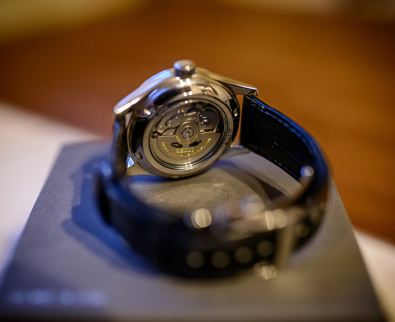 Мануфактурный механизм с запасом хода и круговой датой, к которой очень быстро привыкаешь.
