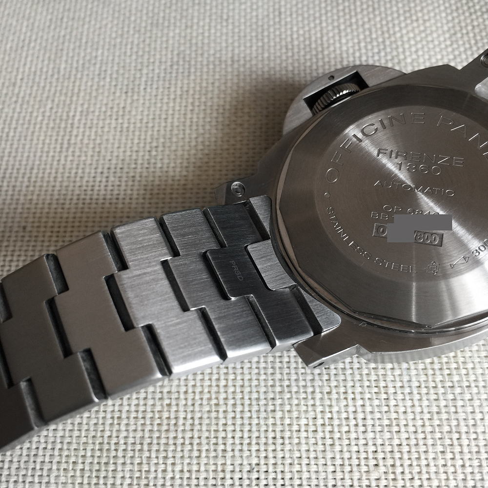 Еще одна особенность этой модели - обработка корпуса. Лично мне нравятся сочетание полированных и матовых поверхностей корпуса. Матовый сатинированный корпус в сочетании с полированным безелем выглядит поинтереснее, чем просто полностью полированный корпус. При этом, в текущей линейке классических Люминоров, таких моделей с комбинированной отделкой корпуса кот наплакал - всего 3! Это PAM164, PAM299 и PAM297. Так что даже со снятым ремнем, часы не спутать с другой моделью, они отличаются от упомянутых выше 104 - у тех корпус полностью полированный.
