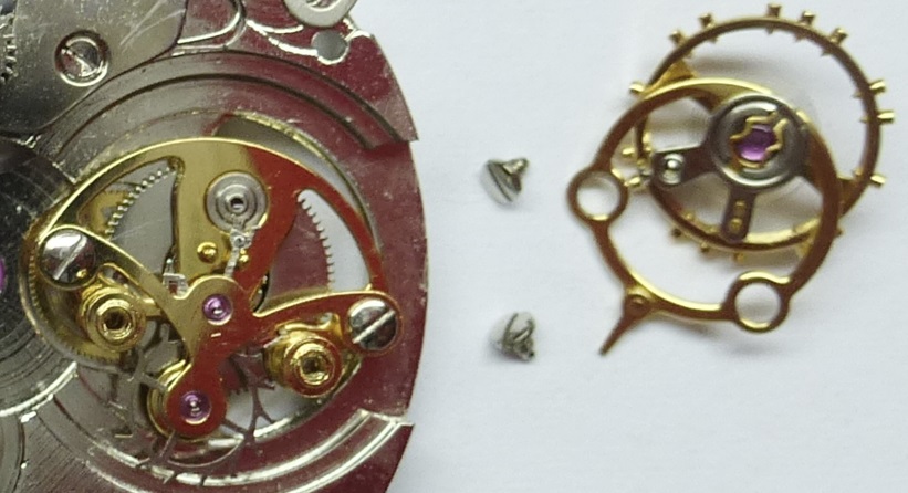 После удаления якоря и якорного колеса, вы смотрите два винт серебряного колеса (красный). Это второе колесо и привинчивается к пластине движения, поэтому он не может превратить себя! Золотистый является кареткой турбийона.