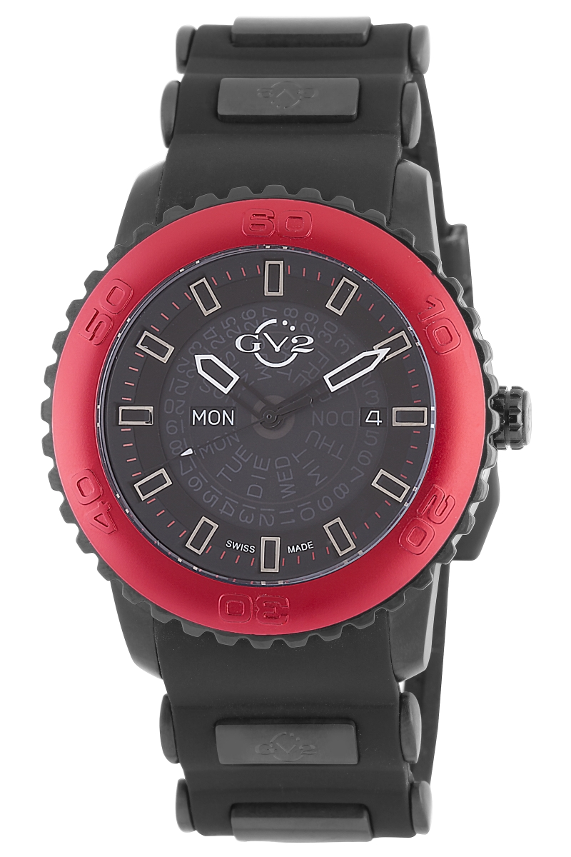 Черный циферблат включает полупрозрачный экран. Под экраном – двуязычная (на немецком и английском языках) индикация дня недели и даты. Текущая дата и день недели появляются в апертурах на 3 и 9 часах соответственно. В положении 12 часов – логотип компании GV2, нанесенный непосредственно на стекло.