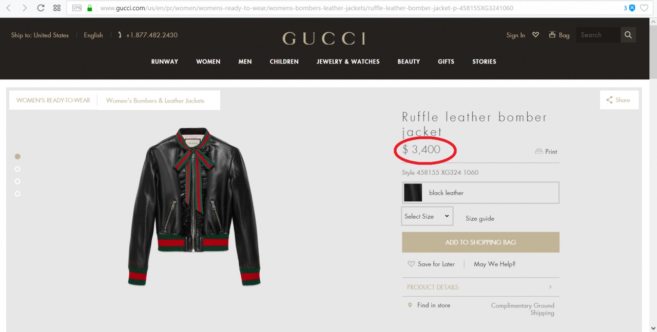 Стоимость аналогичных курток в бутике GUCCI от 170 000 до 350 000 руб.