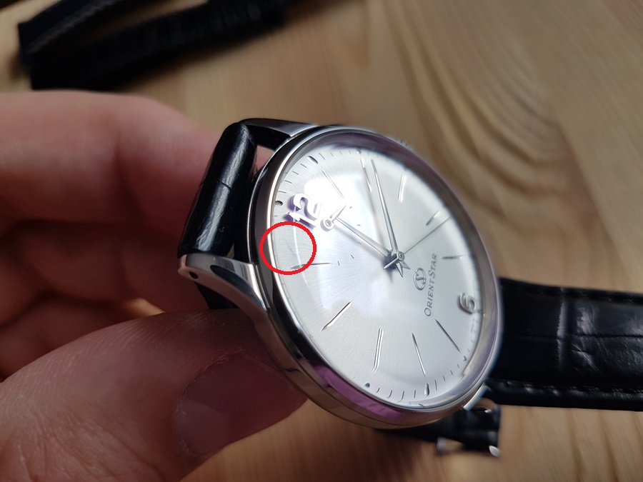 Царапины на корпусе и задней крышке, царапина на стекле (см. на 11 час., заметна под определенным углом).