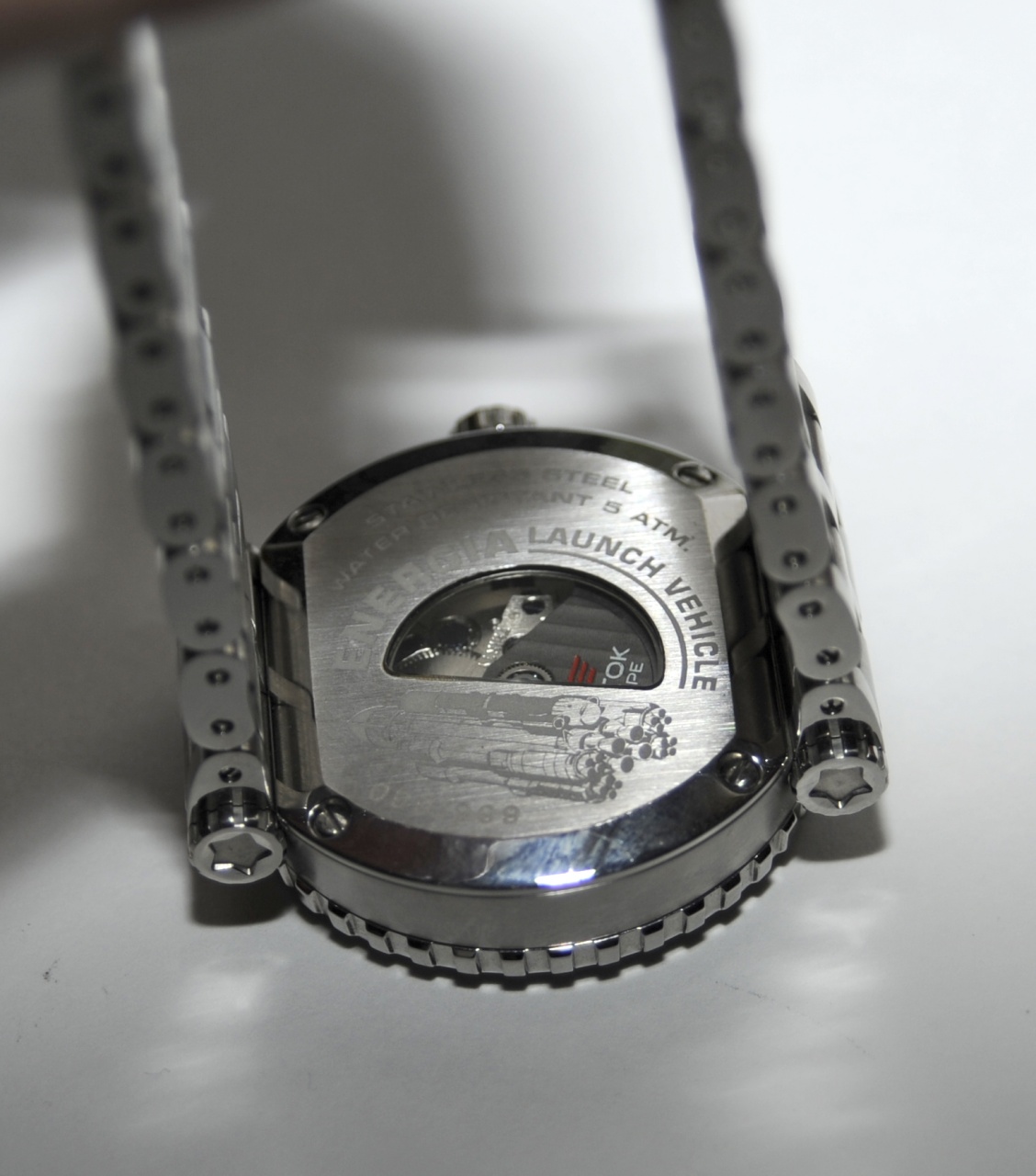 На задней крышке – окошко (бойница скорее, на фото видно). Сатинированная, с лазерным нанесением всяких надписей и изображения ракеты. По ощущениям качество на хорошем уровне. Стекло минералка.