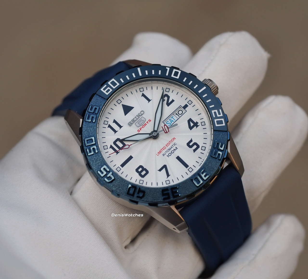 Светлый циферблат с гильёшированием, накладные лого Seiko и 5