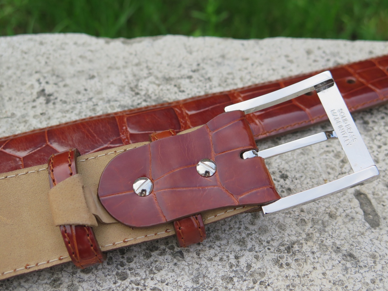 Пряжка изготовлена из никеля, покрытого палладием. Крепление пряжки ремня на двух съемных болтах, позволяет легко укорачивать ремень до нужного размера.