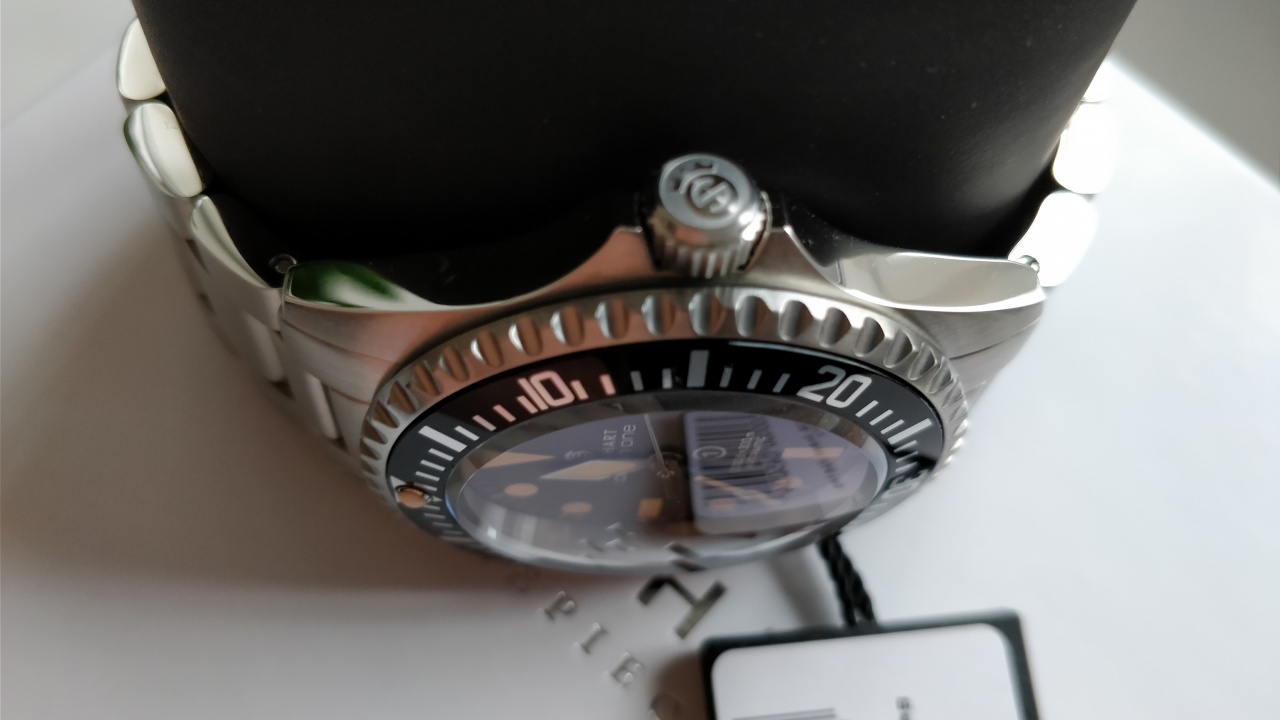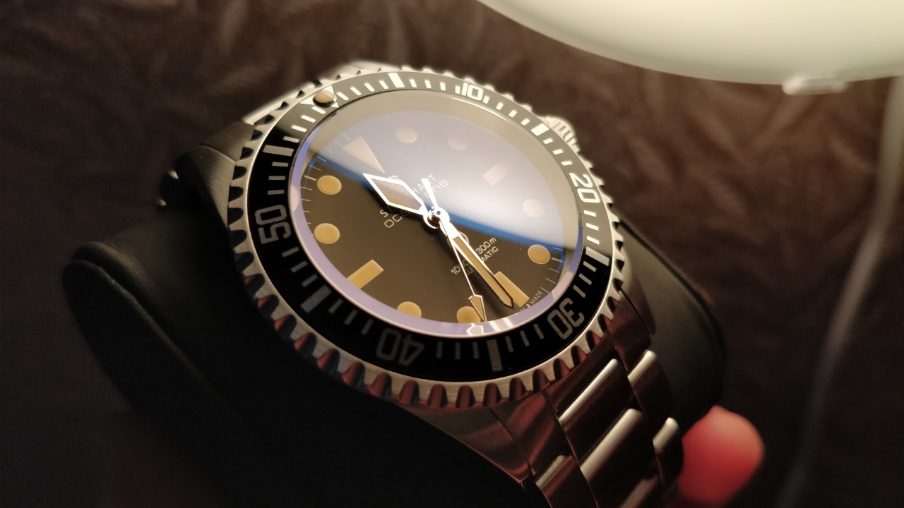 Выпуклый сапфир, золотистые массивные стрелки с мощной Superluminova в стиле Old Radium и серо-бежевый циферблат делают часы привлекательными и заметными,но не кричащими.Эдакий спокойный хищник.