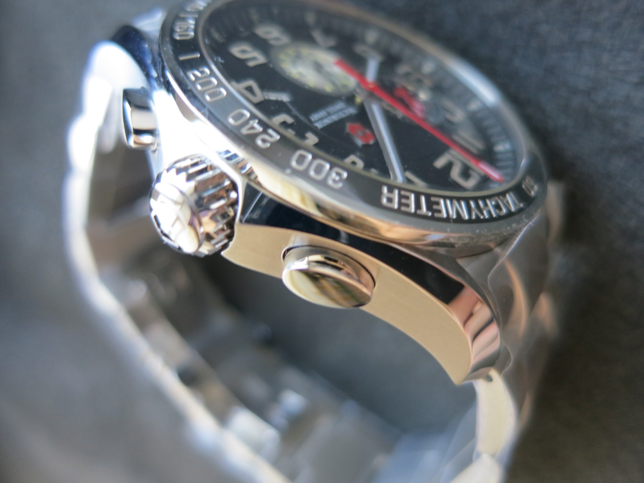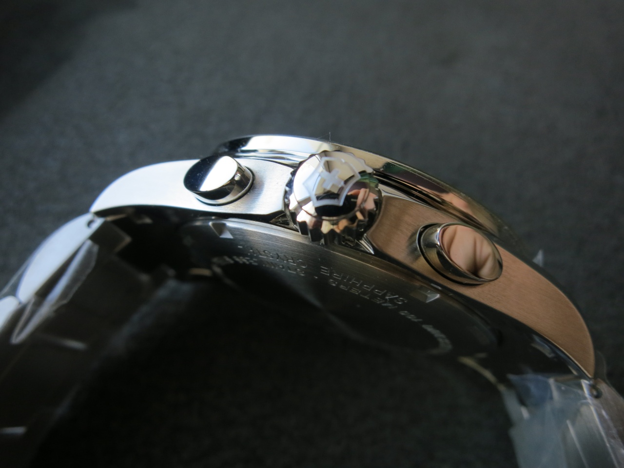 Мужские наручные часы с швейцарским кварцевым механизмом Ronda 5130.D. Корпус этих часов крупного размера (45 мм) и выполнен из нержавеющей стали. Модель имеет сапфировое стекло с антибликовым покрытием, стальной браслет, чёрный циферблат, накладные цифры, люминесцентное покрытие на стрелках и метках. Водоустойчивость: 100 метров, завинчивающаяся задняя крышка. Дополнительные функции и особенности: дата, будильник, хронограф, тахиметр. Страна производства: Швейцария.
