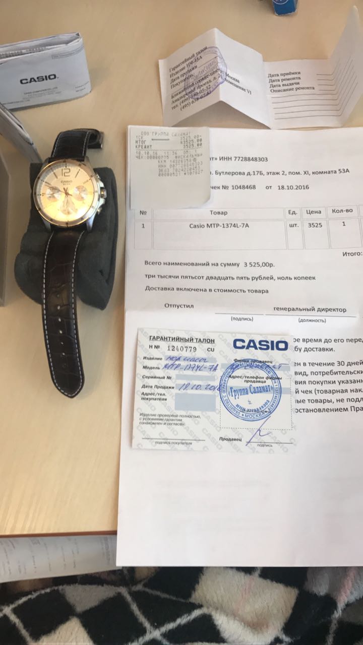 Документы, коробка есть, покупались в Президентвотч за 3500р. (все чеки, гарантийный талон Casio прилагаются)
