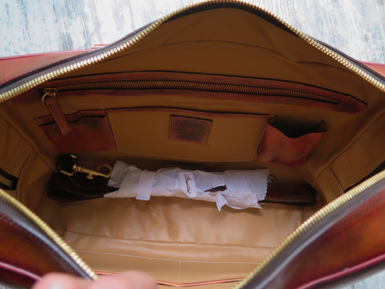 Материал: 100% телячья кожа высочайшего качества выделки, окрашенная полностью вручную в светло-коричневый цвет с эффектом патинирования "антик" и градиентным переходом цвета.