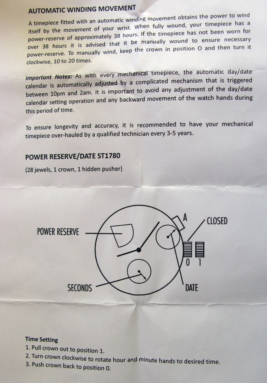 SТ1780, 28 камней, одна двухпозиционная коронка, один скрытый толкатель установки даты. Думаю, достаточно о нем. Описание есть в сети.