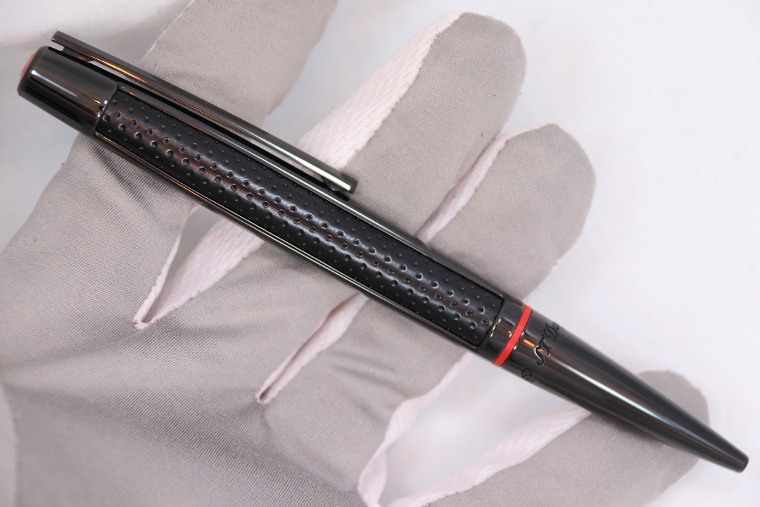 Шариковая ручка S.T. Dupont McLaren Limited Edition представляет собой пишущий инструмент обтекаемой формы, которым исключительно легко писать благодаря идеальной текучести гелевых чернил. Ее конический корпус сочетает в себе металлический каркас, изготовленный высокоточным инжекционным способом, и оболочку из перфорированной с помощью алмазной матрицы кожи с блестящей черной отделкой поверхности.