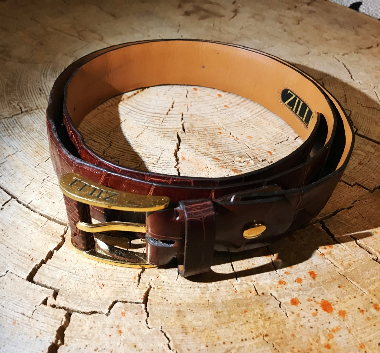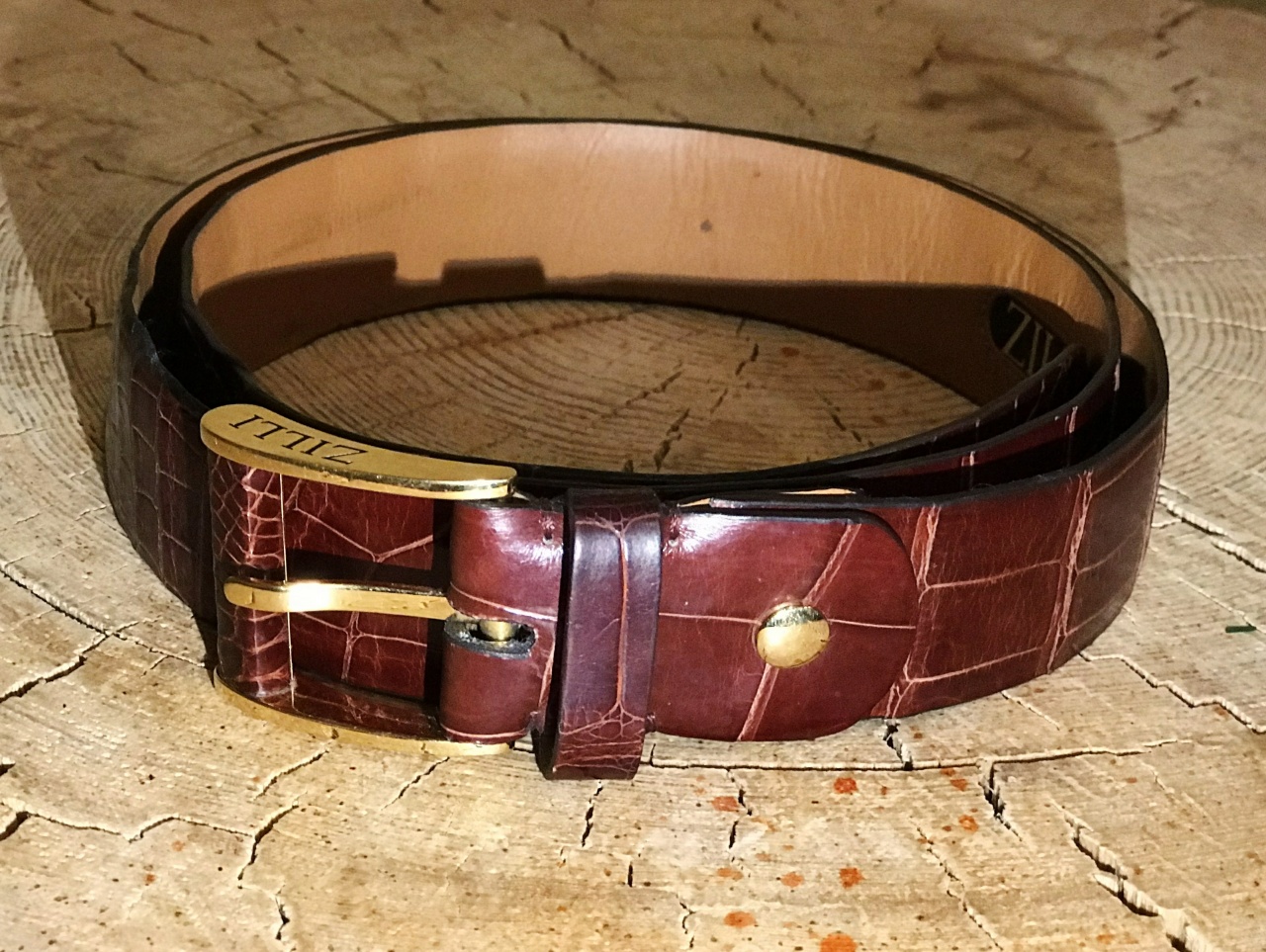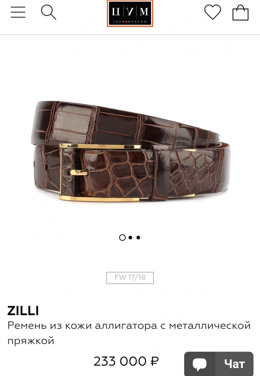 Для производства темно-коричневого ремня мастера марки использовали фактурную кожу аллигатора с глянцевым блеском. Изделие из такого материала прочное, на нем практически не образуются царапины. Золотистая прямоугольная пряжка придает модели блестящий акцент. Такой аксессуар будет уместно смотреться с брюками, джинсами как светлых, так и темных оттенков. Был одет считанное количество раз.
