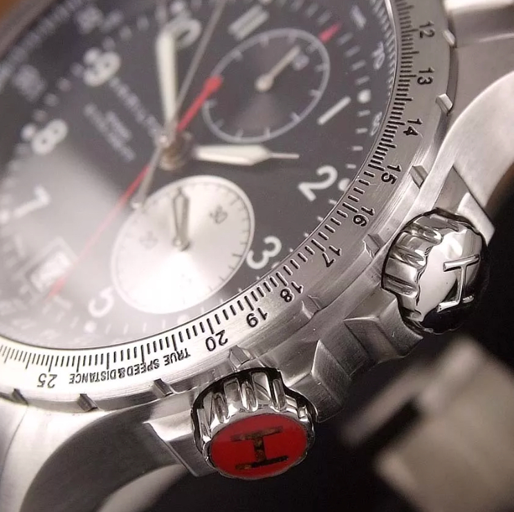 сложная модель с авиационными функциями расчета. Хронограф, логарифмическая линейка, вращающаяся шкала. Индикация даты в положении 6 часов.