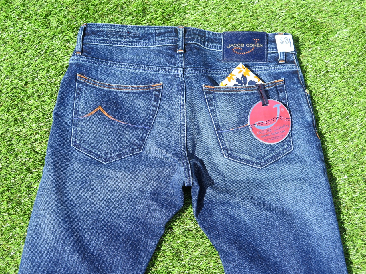 Сзади на правом бедре джинсы имеют фирменный ярлык из кожи пони синего цвета с перфорированным логотипом марки Jасоb Соhеn.