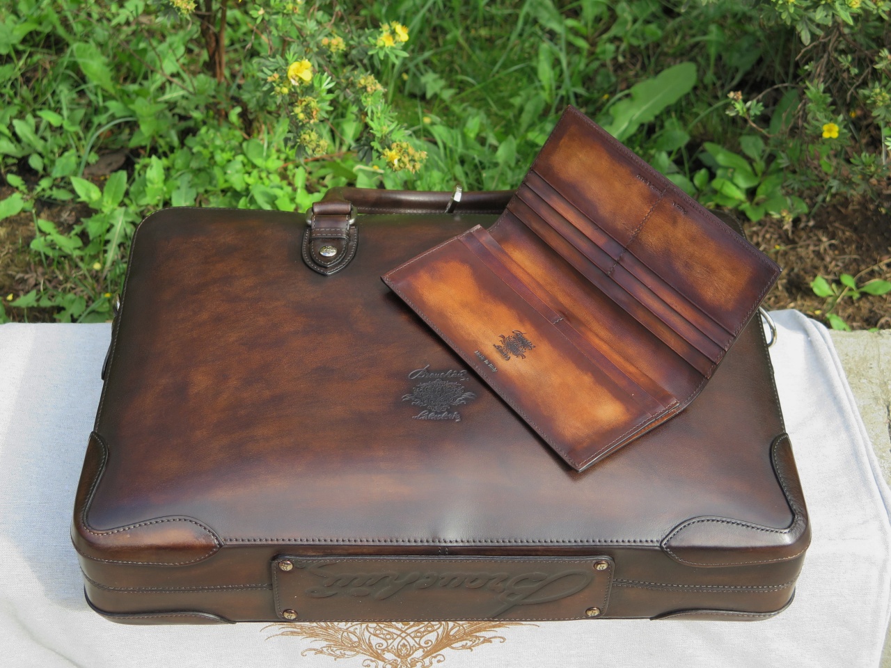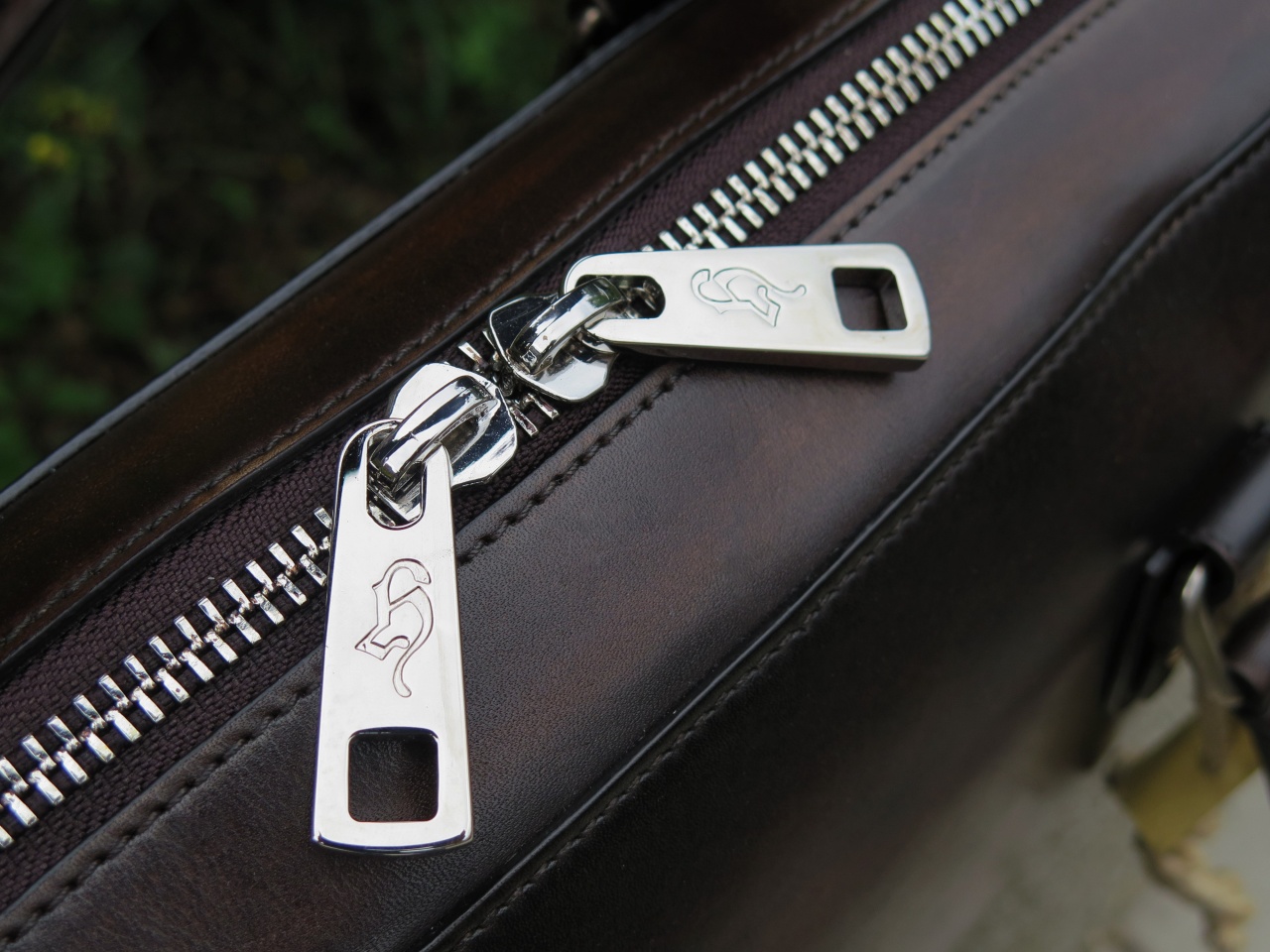 С обратной стороны сумка имеет тесненное изображение логотипа марки «Branchini Calzoleria» в виде герба. Внутренняя часть сумки изготовлена из кожи светло-коричневого цвета, и имеет одно большое отделение для переноски ноутбука, документов и прочих вещей, дополнительное отделение на молнии для хранения сотового телефона, бумажника, паспорта и прочих документов, и два дополнительных отделения.