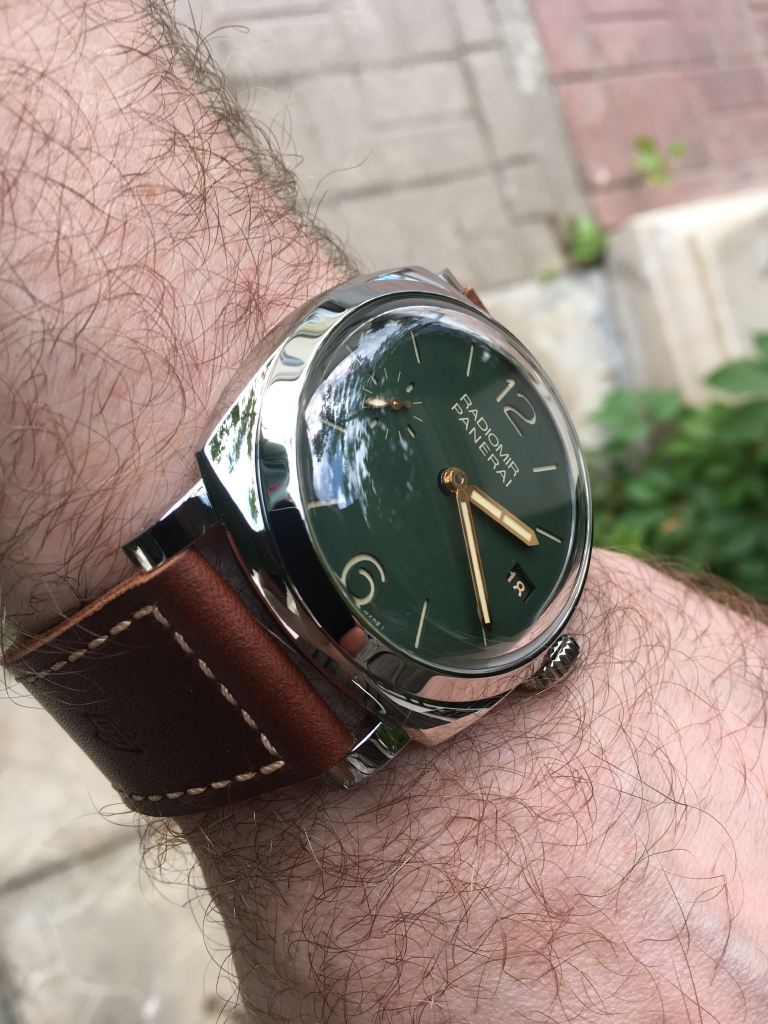 В PAM736 очень нравится купол. Именно купол делает эти часы столь привлекательными. За счет купола, при определенных углах обзора, цвет циферблата "играет" гораздо лучше, чем на PAM735. Ради купола я даже готов смириться с P3000 на борту) Более тонкие, по сравнению с PAM735, часовые метки песочной люминовы, в сочетании с зеленым-милитари цветом циферблата смотрятся очень изящно. Полированный корпус очень идет данной модели. Часы смотрятся ярко.