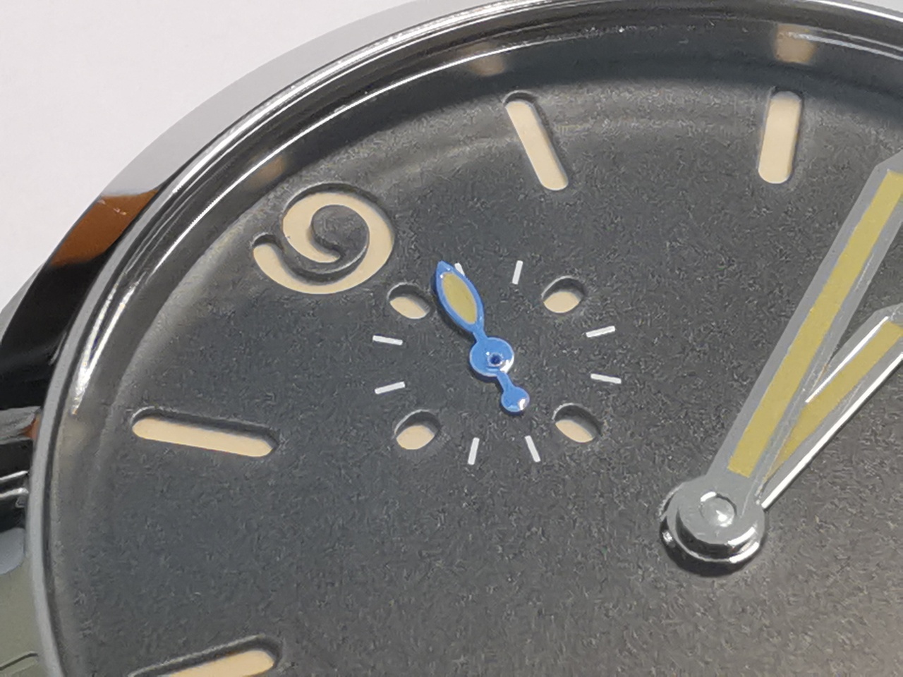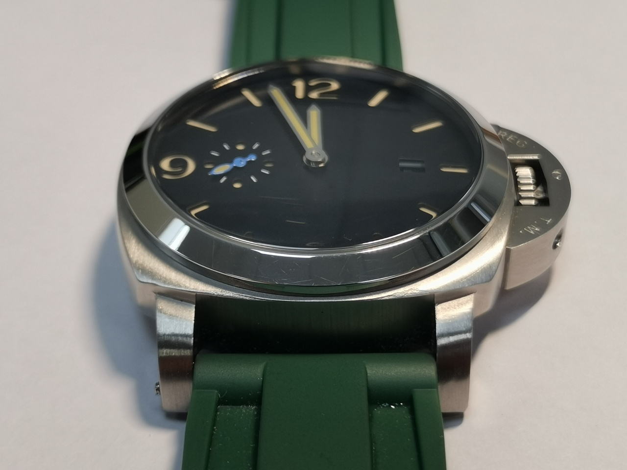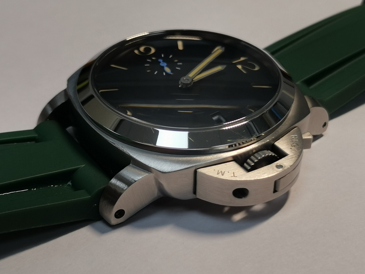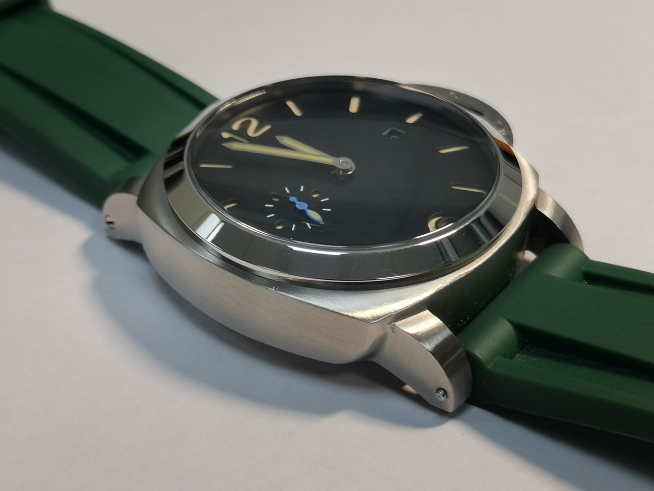Поскольку я так или иначе начал рассказывать о часах, то всё таки расскажу чем они мне понравились. В первую очередь это стрелки. Гармоничной длины и ширины, простые мечевидные, никелированные, с наполнением люминофором в центральной части. Люминофор не яркий, но светит довольно продолжительно. Мне понравился цвет люминофорного состава, он зеленовато-бежево-серый, очень винтажный. Циферблат сэндвич тоже неплох, с люминофором того же цвета, что и на стрелках, однако светит поярче и подольше. Поле циферблата черного матового цвета с аккуратными вырезами под часовые метки. У меня есть псевдопам от Сан Мартина, со схожим циферблатом, и с более богатой окраской, однако этот мне нравится больше, так как все часовые метки наблюдаются полноценно без искажений. Безель ровный, классический, полированный, придраться практически не к чему, разве что на нем видны отпечатки пальцев и микроцарапины как результат эксплуатации часов. Стекло минеральное, полукупольное, довольно неплохое, правда, бликует. Корпусу я выше уделил достаточно внимания, поэтому, только сообщу его габариты: диаметр 44мм, диаметр с заводной головкой и запорной скобой 50мм, от ушка до ушка 54мм, между ушек 24мм, толщина корпуса 16мм.