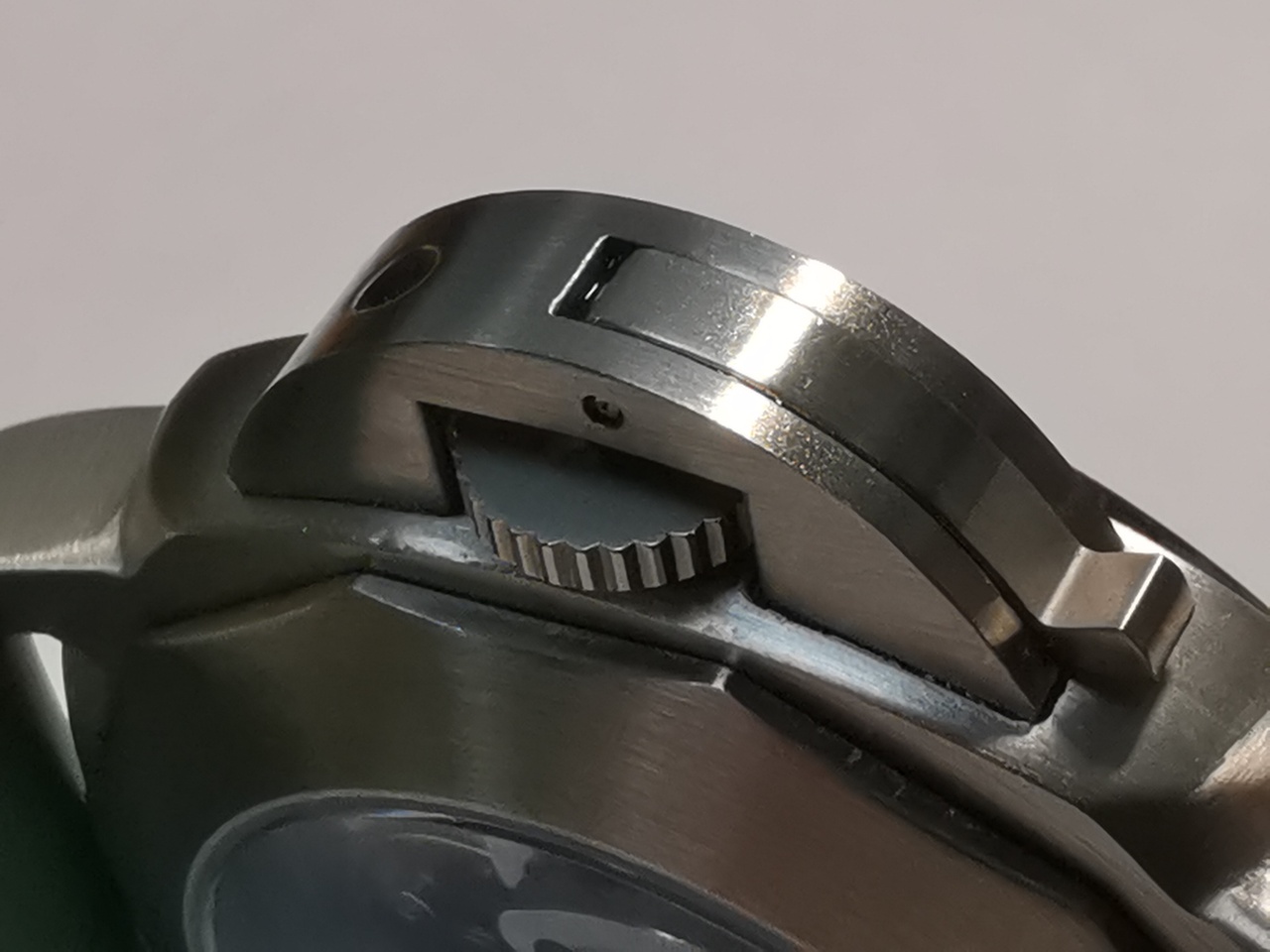 Заводная головка таблетковидной формы с насечкой зубчиками по гурту, имеет прокладочку, воду не пропускает. Запорная скоба брутально простая, с плохо обработанным рычагом, который имеет колесико. Под рычагом имеется некая таинственная кнопка, которая имеет продолжение в виде штырька внутри корпуса, удерживаюшего металлическое кольцо для фиксации механизма, что несколько осложняет монтаж кольца, так как его необходимо сначала «подсунуть» под штырёк. Винтики для монтажа запорной скобы из довольно мягкого металла, и после неоднократных манипуляций с ними, имеют довольно разношенный шлиц.