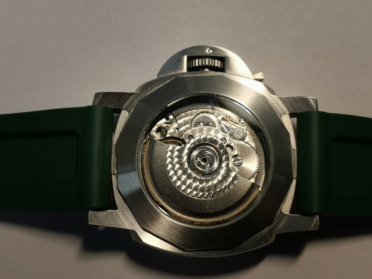 Задняя крышка завинчивающаяся с помощью специального ключа, приподнятая, сатинированная, имеет по центру довольно обширное, круглое стеклянное окно, через которое виден механизм и удерживающее его кольцо. Механизм(st2557) довольно неплох, я не ожидал, что он окажется настолько точным. Убегание вперед можно заметить только через неделю непрерывной носки.