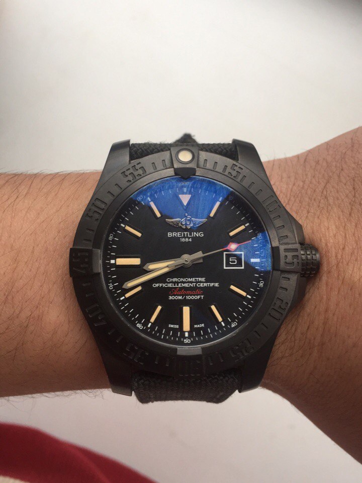Breitling Avenger Blackbird Titanium Military Bracelet Black Dial, часы в отличном состоянии куплены в начале 2017 г., носились очень аккуратно, не смог найти даже малейших царапин.На фото постарался отразить состояние ремешка, он в принципе на уверенную 4, минус - заношенные тренчики, наверное это болячка этих ремешков,повторюсь ничего экстремального в этих часах не делалось). Любые проверки приветствуются. В приоритете продажа...... но возможен и обмен исключительно с вашей доплатой.