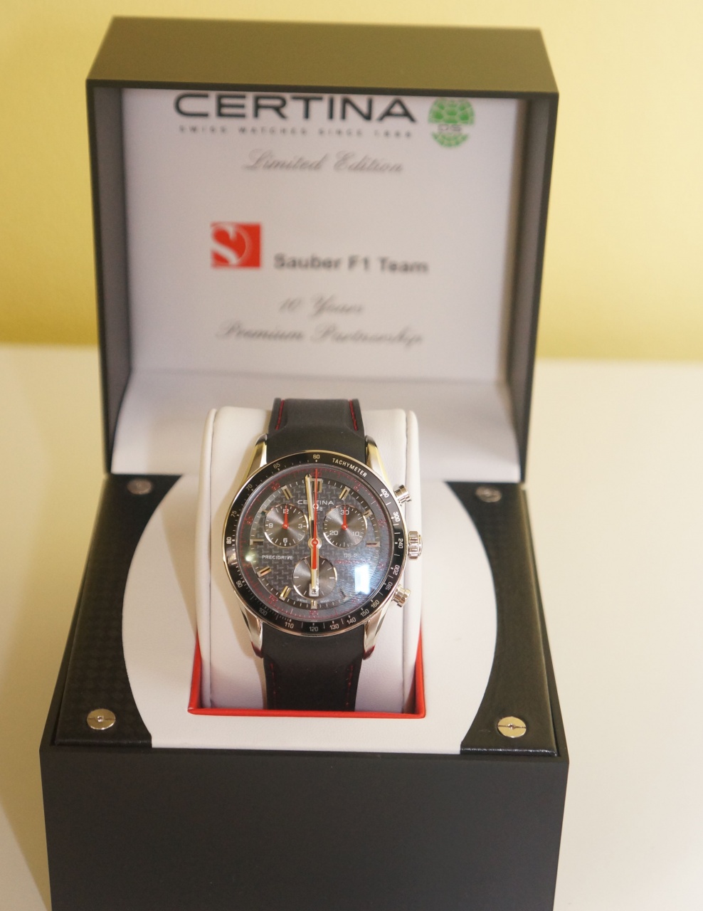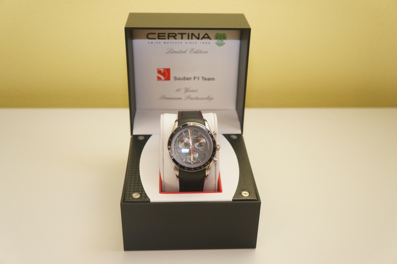 Часы выпущены в честь 10-летия сотрудничества компании Certina с командой Формулы 1 Sauber. Ограниченный выпуск 2014 экземпляров. Многофункциональный хронограф с счетчиками часов, минут, секунд и 100-х долей секунд, люминесцентное покрытие индексов, часовой и минутной стрелок, индикация даты и вынесенная секундная стрелка на "6" часов, тахиметрическая шкала.