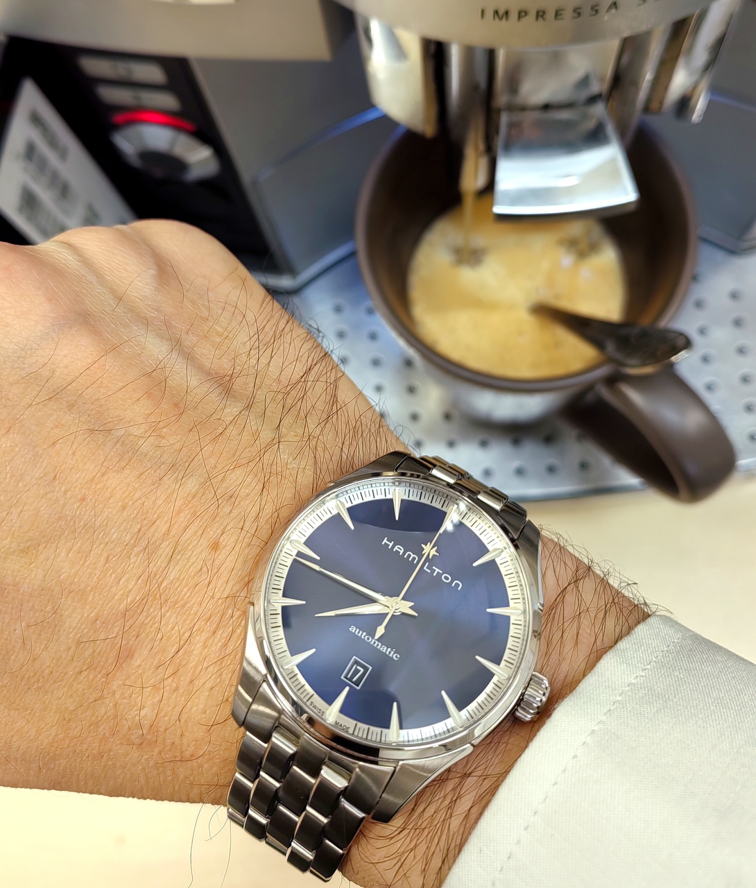 Покупка эта была довольно спонтанной. Марка Hamilton до последнего времени меня особо не привлекала. Филды и авиационная тематика на меня впечатления не производят, дайверские хэмы тоже не впечатляют, ничем не лучше аналогов японского производства и других швейцарских марок. Но совсем недавно захотелось чего-то строгого, делового, костюмного и не предназначенного для других целей. Требования были просты: сталь, три стрелки + дата, сапфир, браслет. Выбирал не долго, ровно до тех пор пока не попался мне в подборке джазмастер. Ранее я совершенно спокойно проходил мимо него, а тут взглянул на него совершенно по новому, зацепил меня вариант "автомата" с синим цифером на браслете. Начал его изучать, разглядывать, и он мне стал нравится всё больше и больше. И тут именно такой вариант подвернулся на маркете. Звезды сошлись, так сказать!