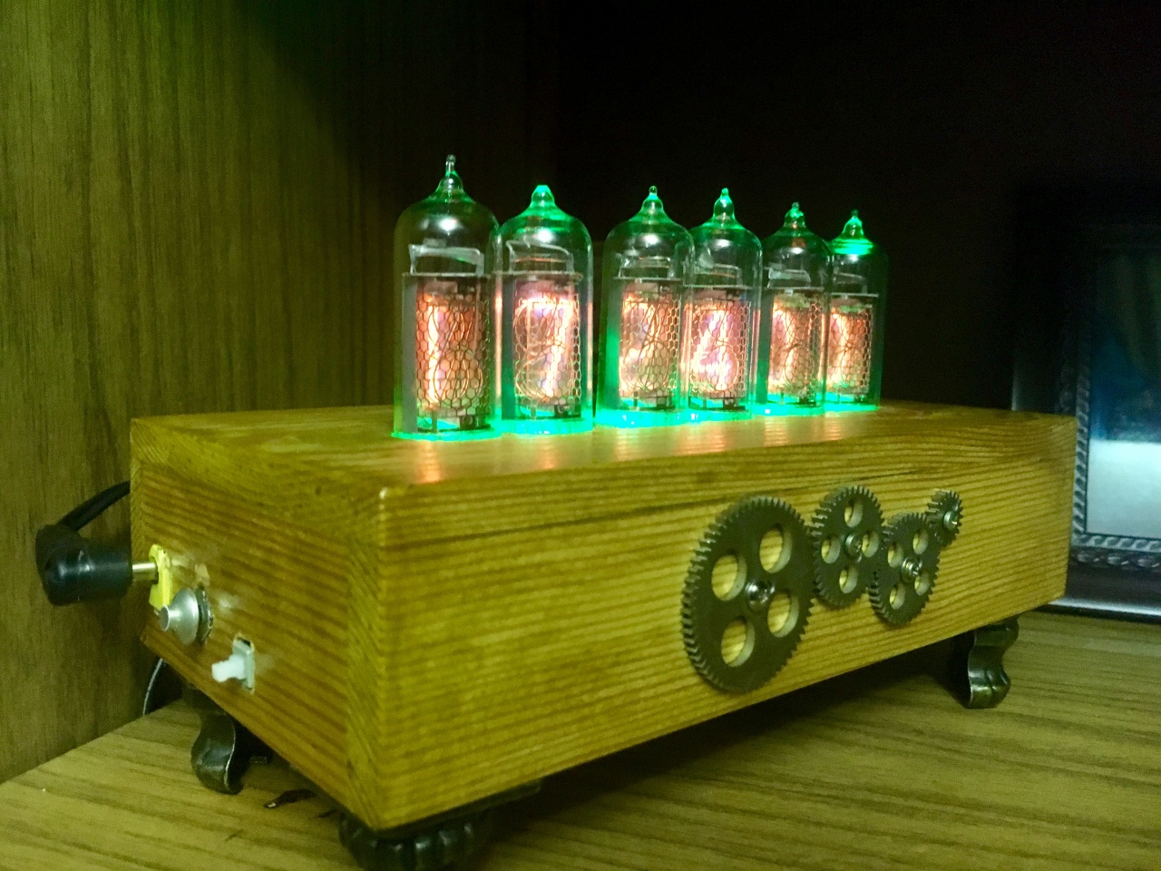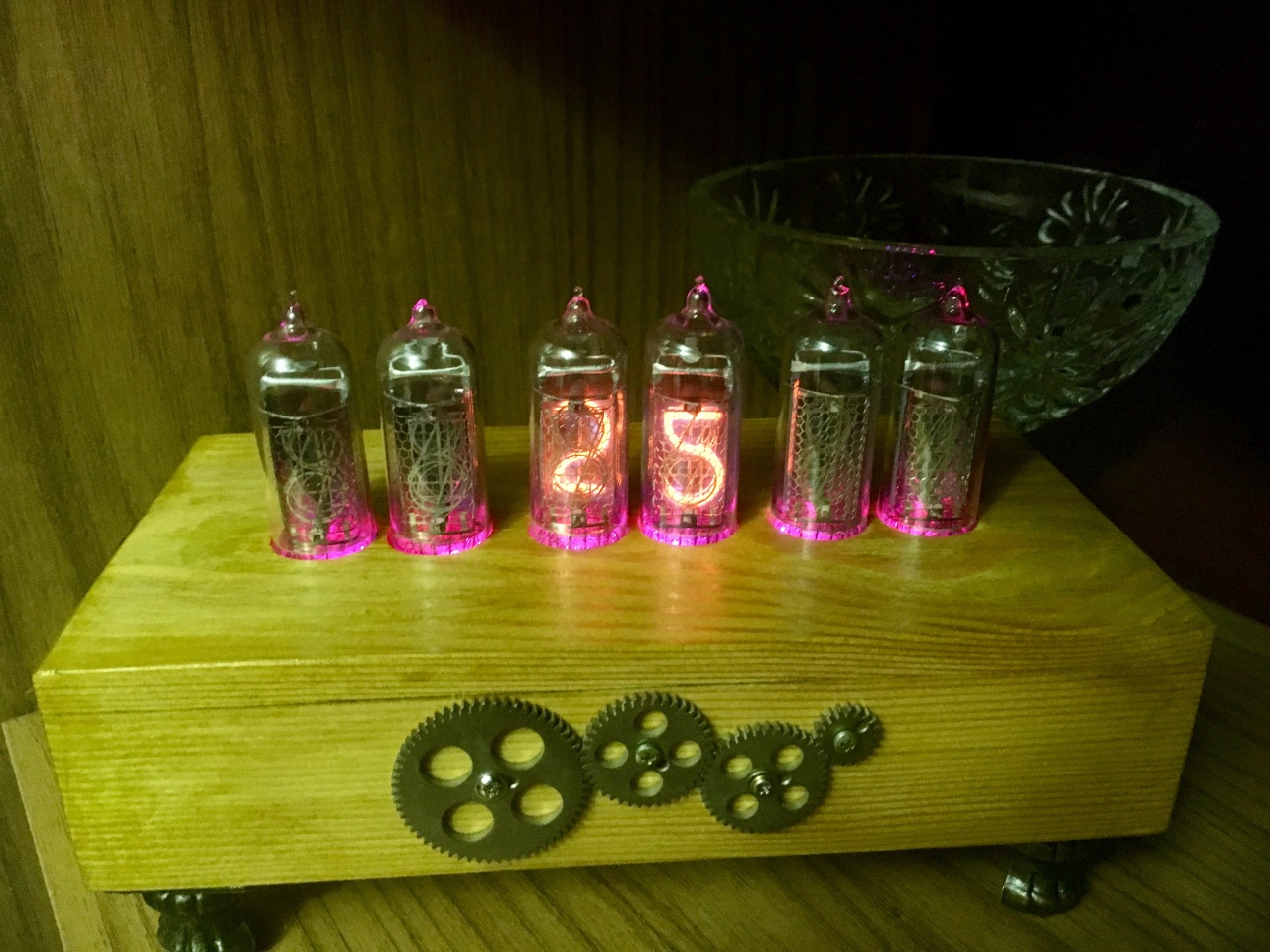 корпус из дерева покрытым лаком. Часы имеют высокую точность хода программно коректируемого, есть Календарь и термометр, а так же подсветку RGB отключаемую. 6 режимов отображения времени. Стоит комплект новых ламп. Индикация динамическая (ламп хватит на много много лет!) отправка за счёт покупателя ТК или почтой. Питание 12в блок питания в комплекте.