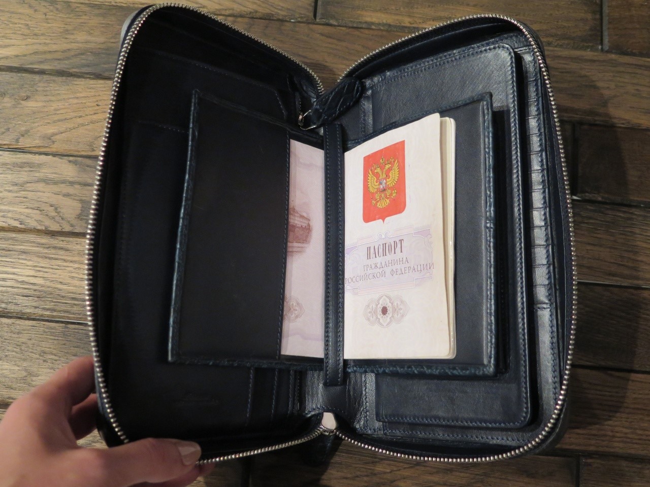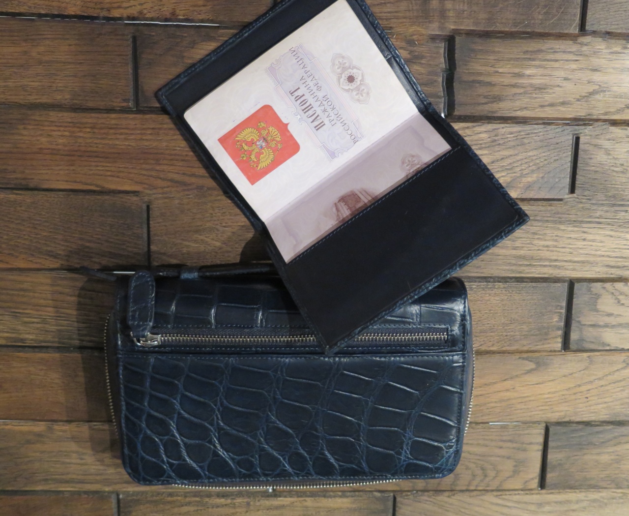 Дополнительным БОНУСОМ (!), идущим в комплекте к клатчу, является обложка для паспорта, изготовленная из кожи крокодила тёмно-синего цвета.
