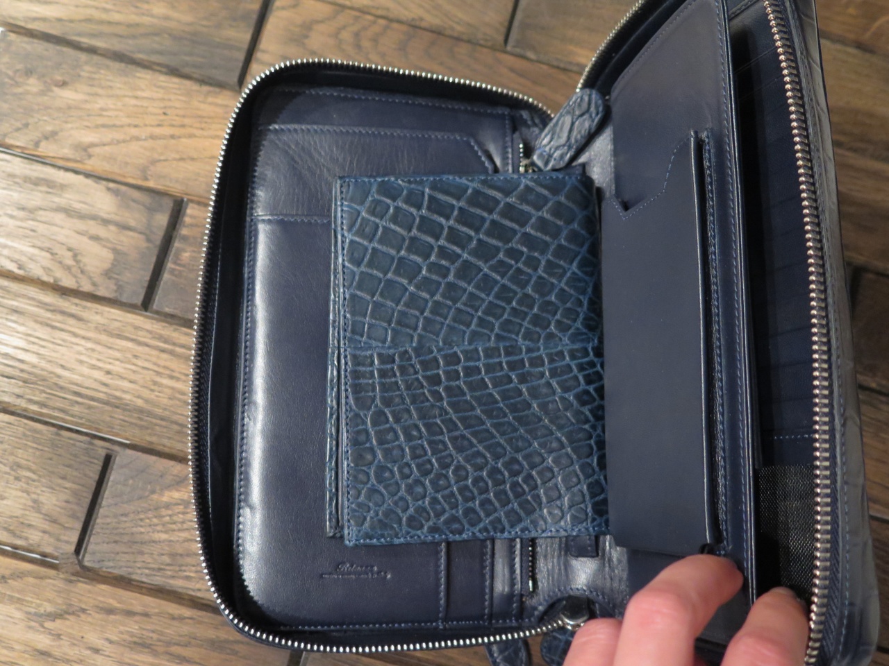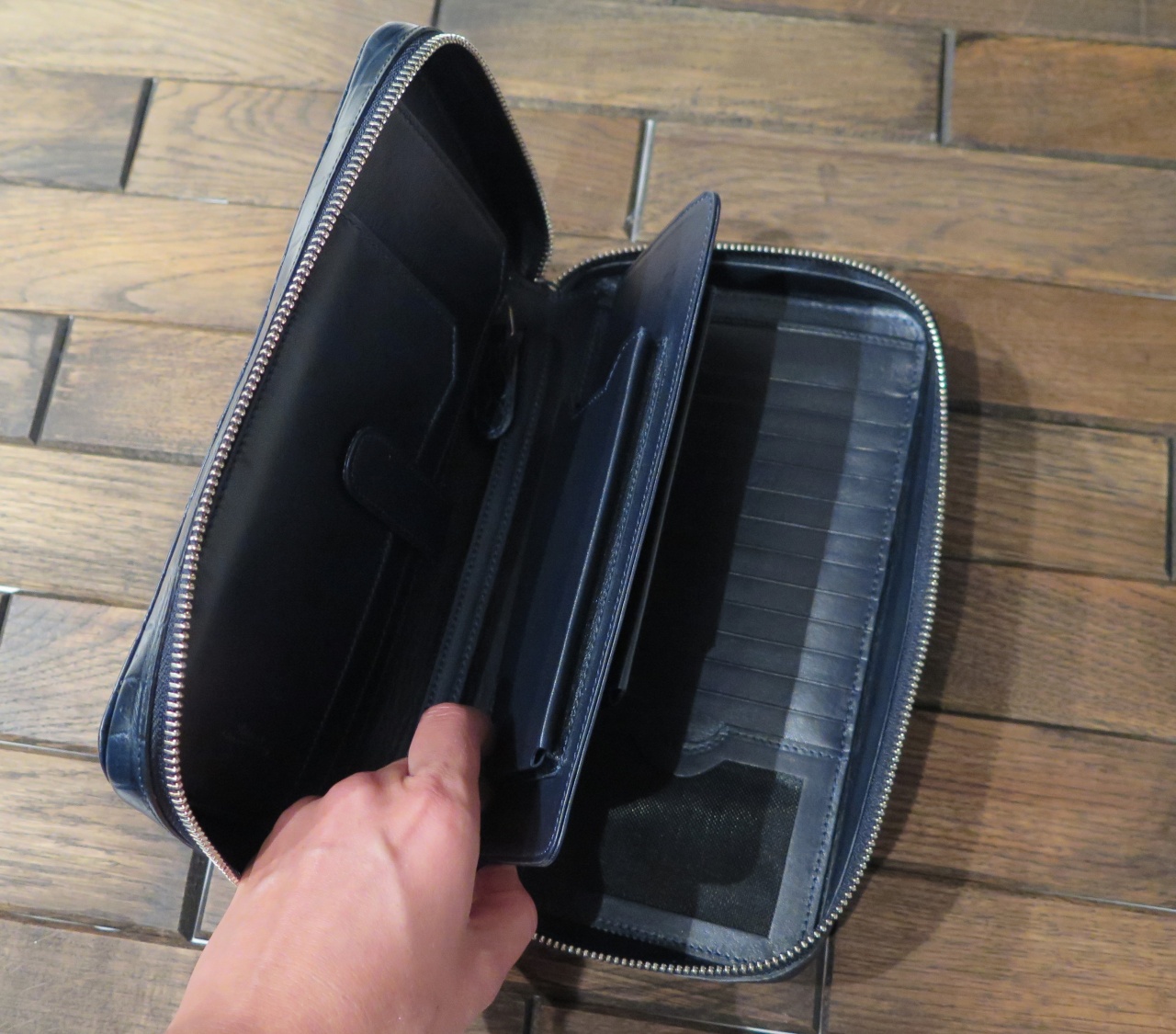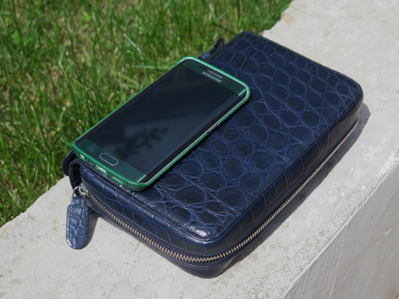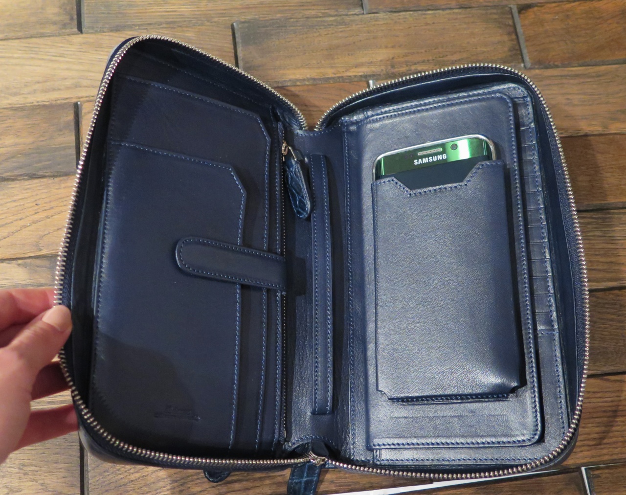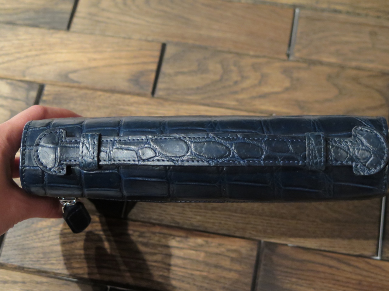 Внутри клатч изготовлен из супер-мягкой кожи ягненка тёмно-синего цвета с отделкой из кожи крокодил тёмно-синего цвета, и имеет основное вместительное отделение с разграничителем с двумя слотами-карманами для смартфонов типа iPhone 7, 12 отделений для кредитных карт или визиток, дополнительное отделение с прозрачным окошком для водительских прав, дополнительное отделение на молнии с бегунком из кожи крокодила, отделение для банкнот, и два дополнительных кармана для документов, квитанций и т.д с застёжкой на кнопке.