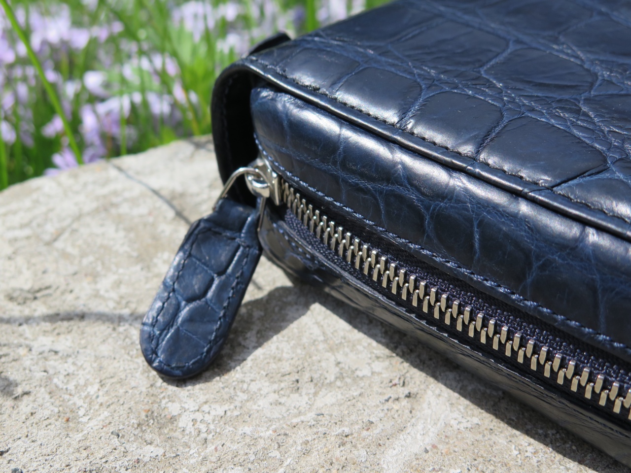 Клатч застёгивается на молнию, изготовленную из никеля, покрытого палладием, с бегунком из кожи крокодила.